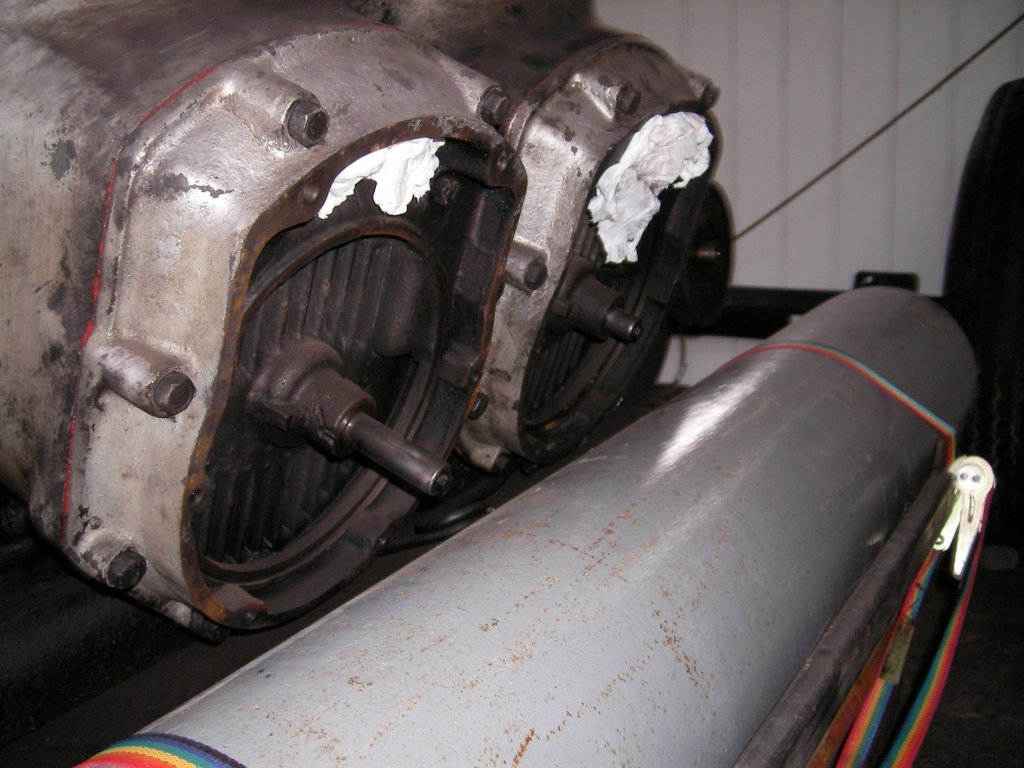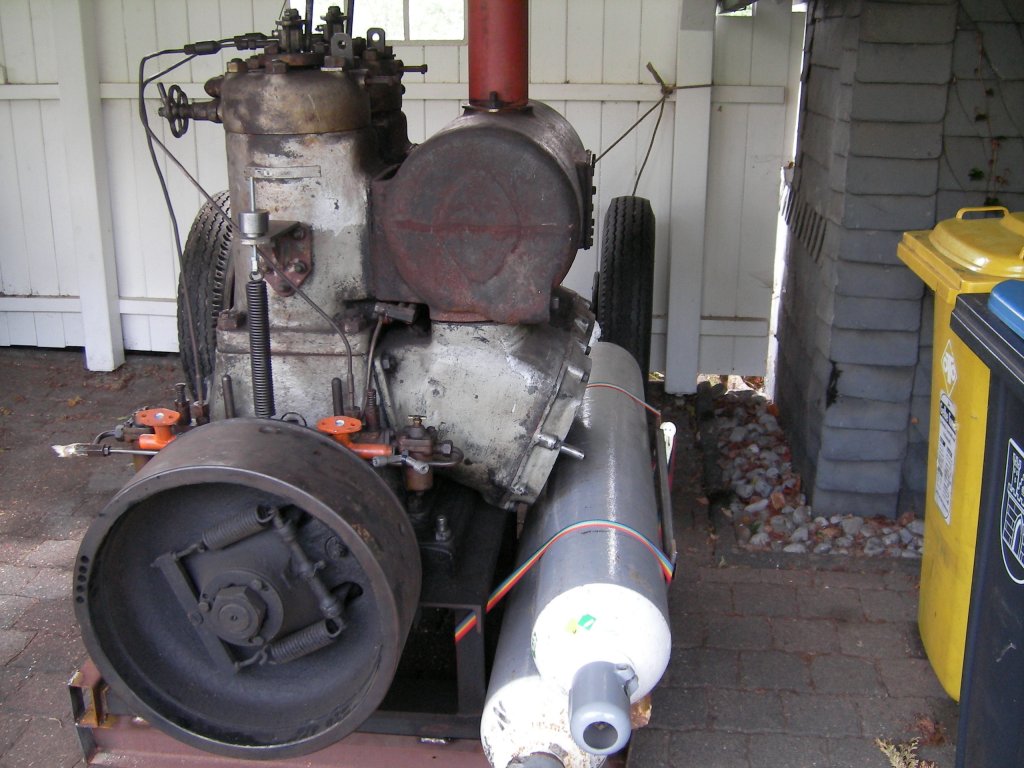 Ziemlich komplett, aber die Deckel der beiden Spülpumpen fehlen - ich hoffe, da bessert die Verkäuferin noch nach, sonst habe ich ein Problem, sind sicher schwer zu kriegen die Teile. Die Verrohrung der Luftstarteinrichtung fehlt natürlich, ebenso ein Dieseltank, da er von einem Schiff stammt, wo er an den Haupttank angeschlossen war. Was ich noch nicht gefunden habe, ist eine Kühlwasserpumpe, keine Ahnung, ob ein Schiff da eine externe Pumpe hat, zumindest habe ich einen kleinen Nebenantrieb mit Riemenscheibe am Motor, da gibt's sicher noch was von Ratiopharm... Als Schiffsmotor müsste er eigentlich eine Kühlwasserpumpe und eine Lenzpumpe haben, so sagt die BDA, hat er aber nicht. Dass die irgendwo abmontiert worden wären, kann man auch nicht erkennen.