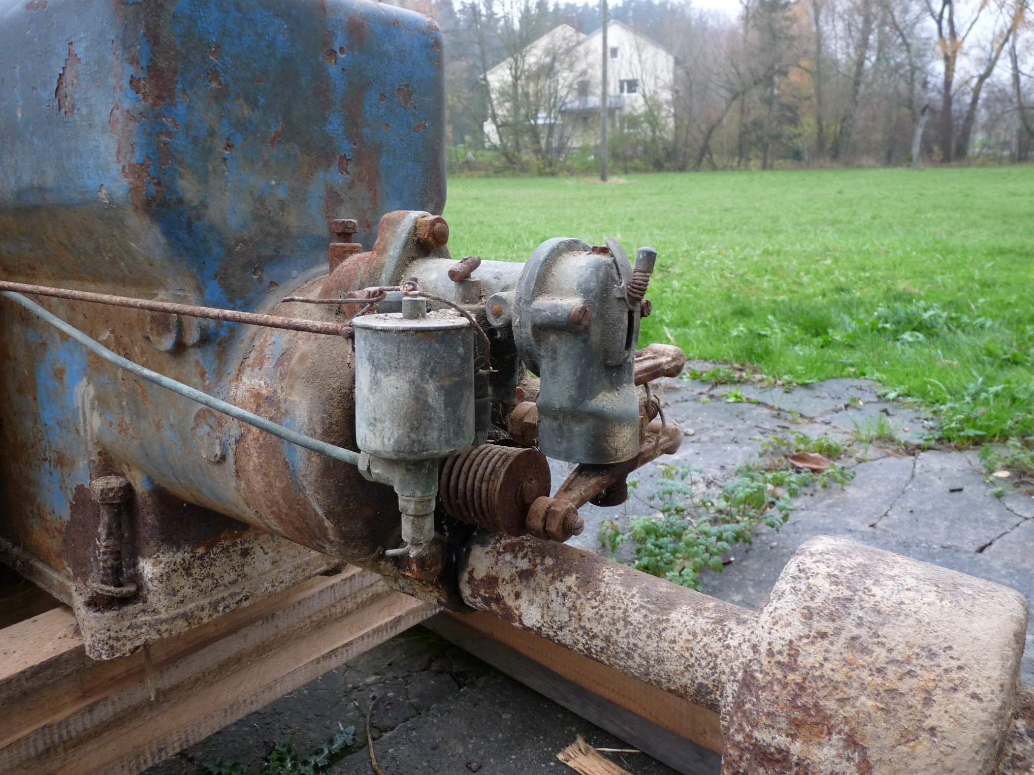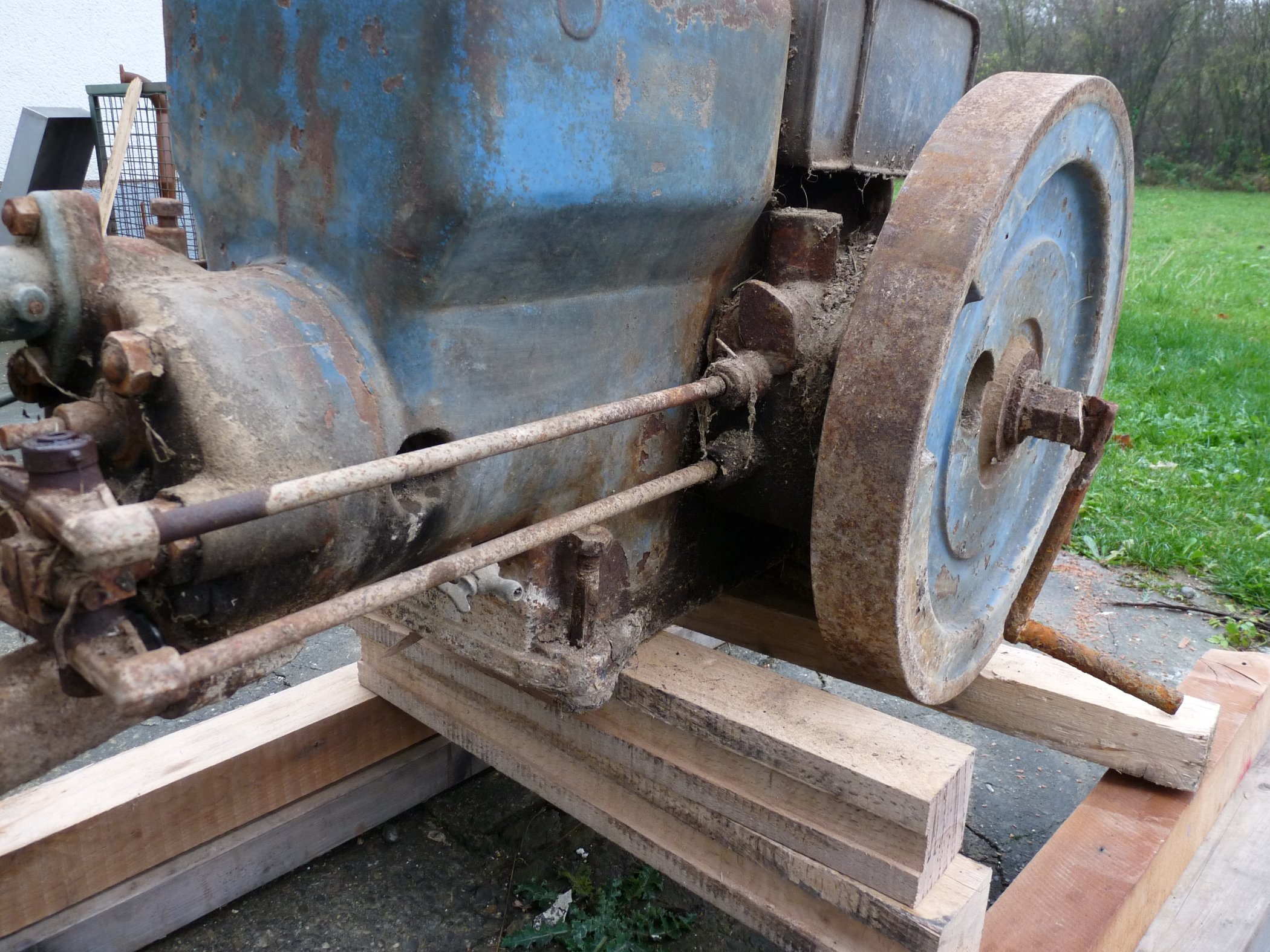 ) und augenscheinlich kein Frostriß. Also am Freitag kurz hoch nach Immenstadt im schönen Algäu gefahren und den Brocken abgeholt. Dachte zuerst das es ein WS308 ist,stellte sich aber als WS310 raus. Techn. Daten laut Christians Seite:8-10 PS ,750 - 950 U/min , 270 kg , 500 x 60 mm Schwungrad. Laut des Verkäufers lief der Motor ursprünglich in Österreich an einer Seilbahn.