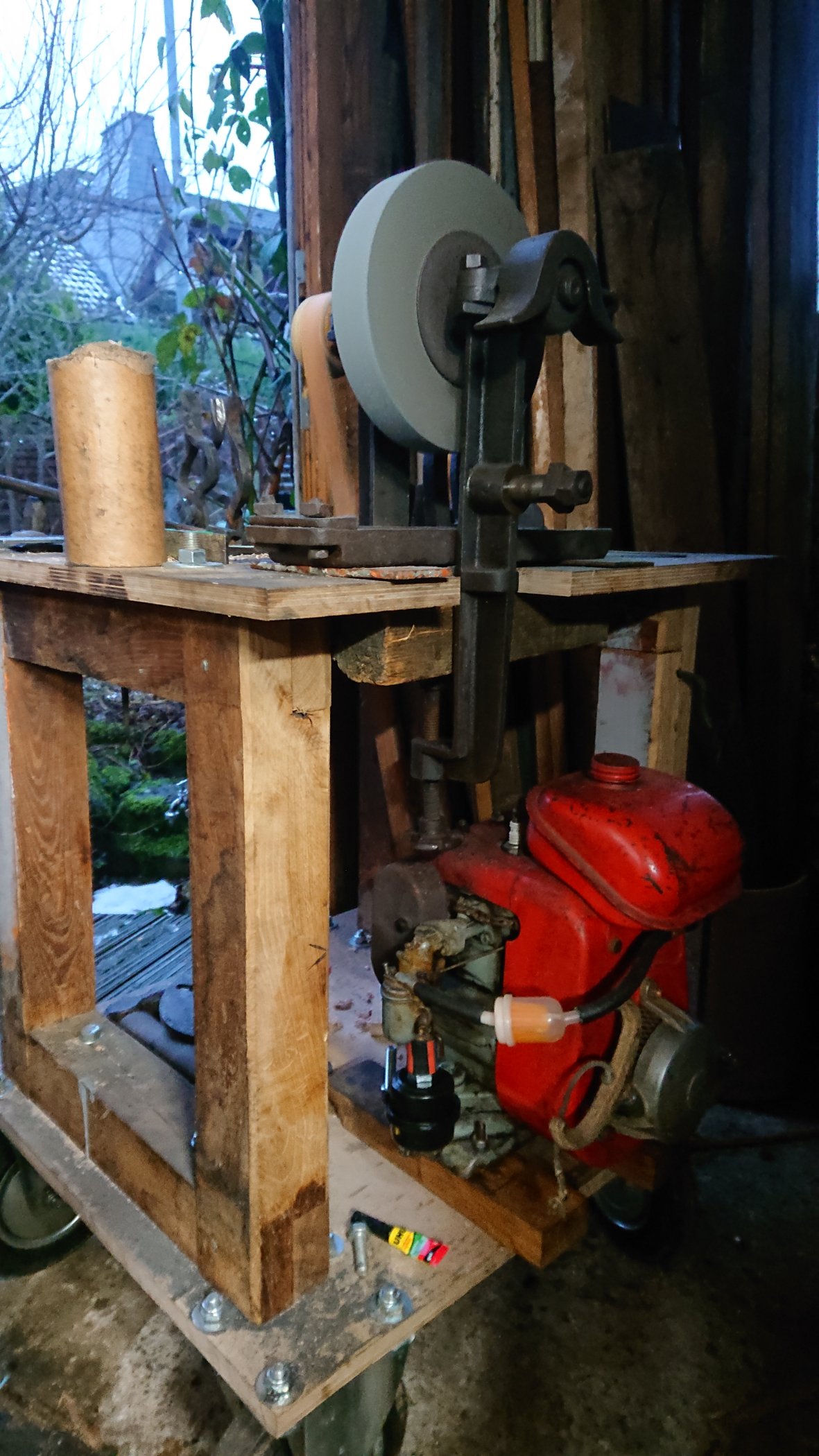 Ich habe meinen alten Rasenmähermotor wieder in den Aktiven Arbeitsdienst zurück geholt. Der Motor treibt einen Schleifstein an der Ursprünglich mit einer Handkurbel angetrieben wurde. Ich habe auf das freie Wellenende eine Riemenscheibe gesetzt und das große Zahnrad ausgebaut. Der Wagen ist eine kleine moblie Schmiede Werkstatt die zerlegbar ist und leicht zu Transportieren.
