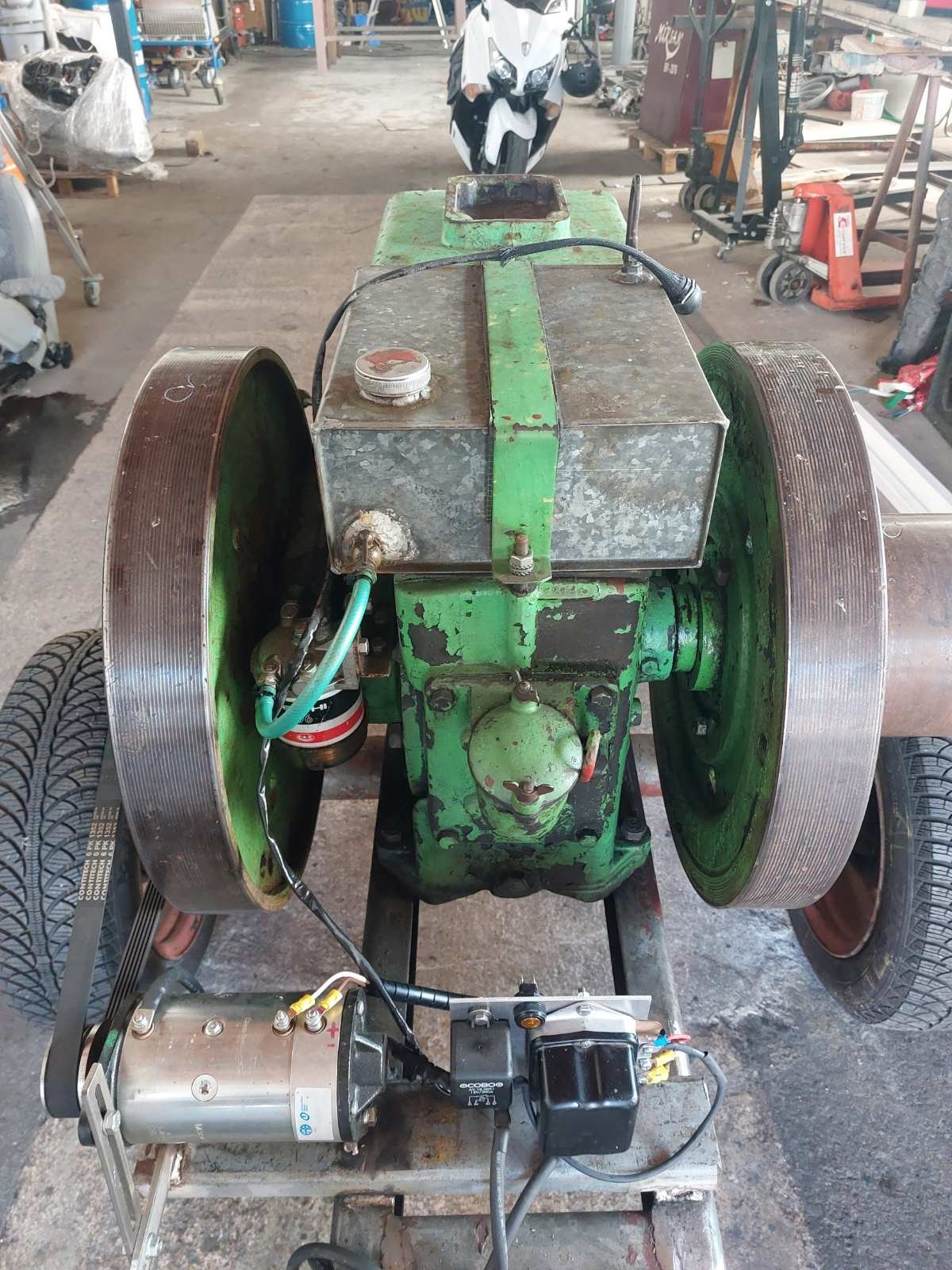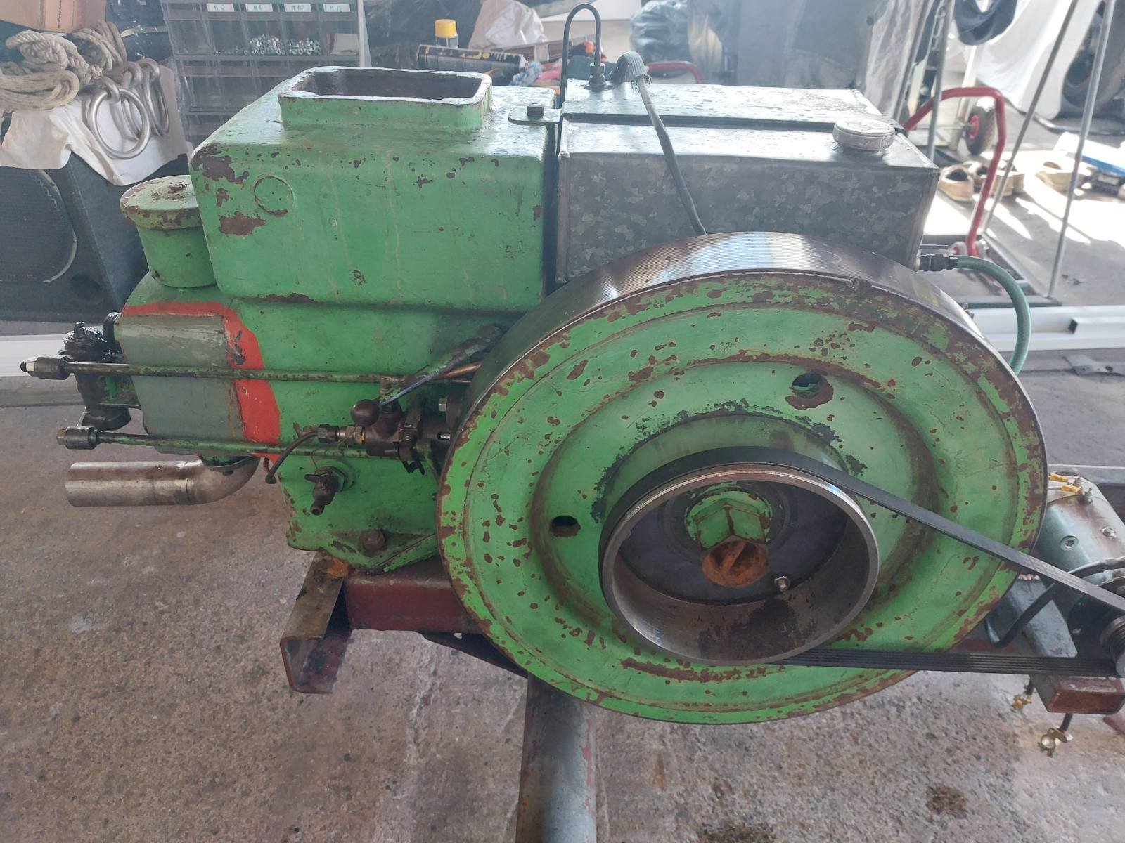 Dies ist ein Sendling-Dieselmotor aus der Vorkriegszeit. Es gab im Wesentlichen 3 Größen, D6, D7 und D12. Verglichen mit der Größe der Wagenräder und der Lichtmaschine ist es wahrscheinlich ein D12. Wenn Du mir die Größe (Breite und Durchmesser) der Schwungräder nennst, kann ich Dir sagen, um welchen Typ es sich handelt. Kannst Du mir die Motornummer abschreiben? Sie sollte über dem Kurbelgehäusedeckel unter dem Kraftstofftank eingeschlagen sein. Ich kann sie auf dem 3. Foto sehen, aber das Bild ist zu unscharf, um sie richtig lesen zu können. Vielleicht kann ich daraus das Herstellungsjahr ableiten. Du kannst auch unter den Motorsockel schauen. Oft (aber nicht immer) ist dort eine Jahreszahl eingegossen. Der Motor scheint eine Mischung von Teilen verschiedener Motoren zu sein. Die Version des Zylinderkopfs ist aus den 1940ern mit dem „Acro“-Luftspeicher im Zylinderkopf. Der Kurbelgehäusedeckel mit dem Entlüftungsventil scheint von einem Motor aus der Mitte der 1930er zu stammen. Dein Motor sollte das Schnüffelventil hinter dem Schwungrad über der Einspritzpumpe haben.