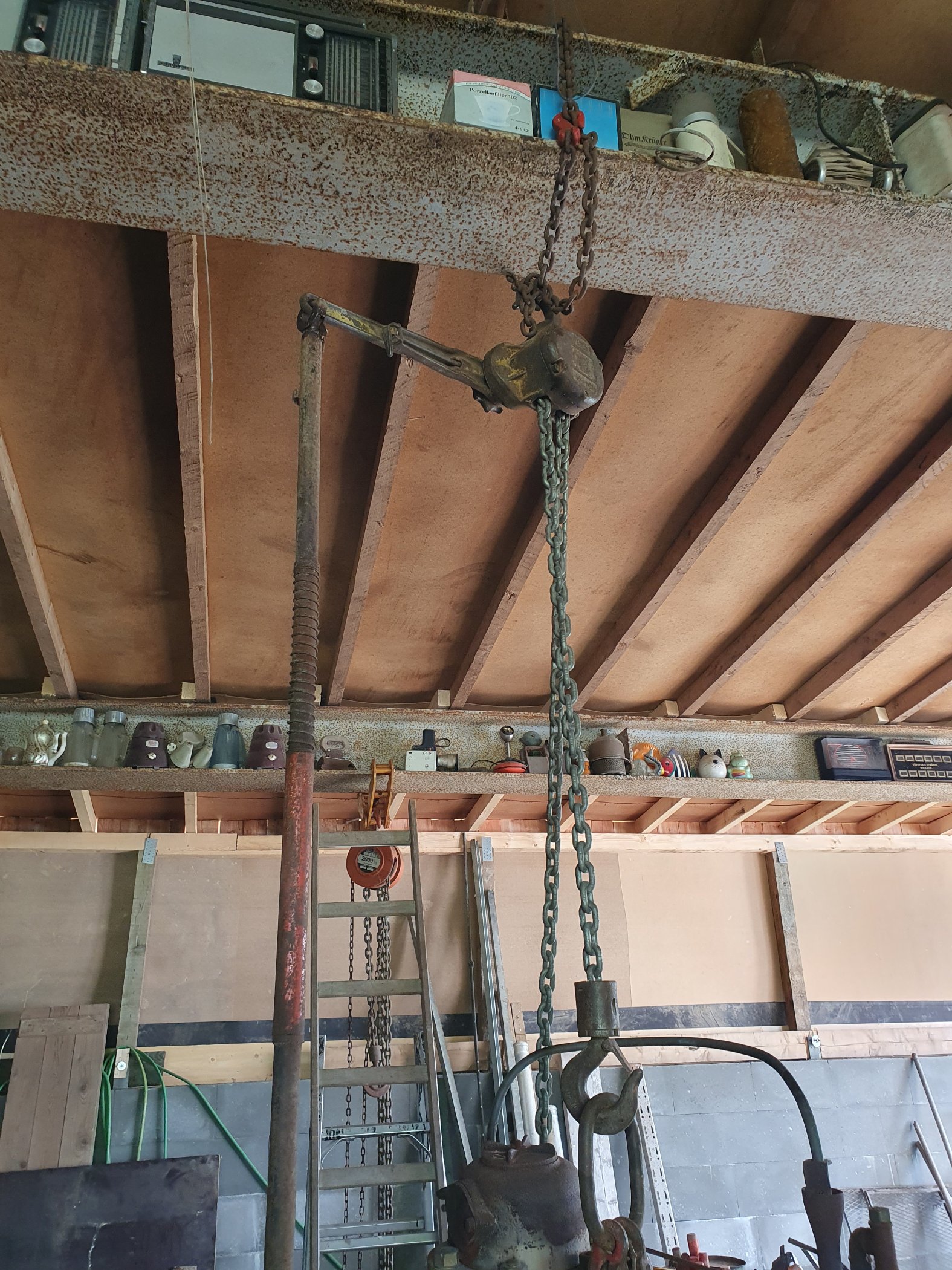 Unter den 2t Kettenzug Kam ich nicht mit dem Anhänger, den Kettenzug umhängen übersteigt meine Kräfte. Einen 1,5t Hubzug konnte ich einhängen - blöde nur den hoch hängenden Zug zu bedienen. Abhilfe fand ich in einer Abschleppstange mit der ich bequem vom Boden aus arbeiten konnte: