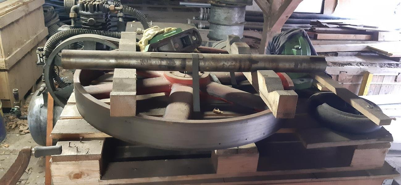 Biete ein Einsteigerset für Transmissionsfreunde, bestehend aus: Riemenscheibe, ca. 950 mm Durchmesser, 100 mm breit, Wellenstück 70 mm Durchmesser, ca. 1 m lang, 2 Stehlager (Wälzlager), 1 Drehelastische Kupplung, alles bestens in Schuss und voll funktionsfähig.