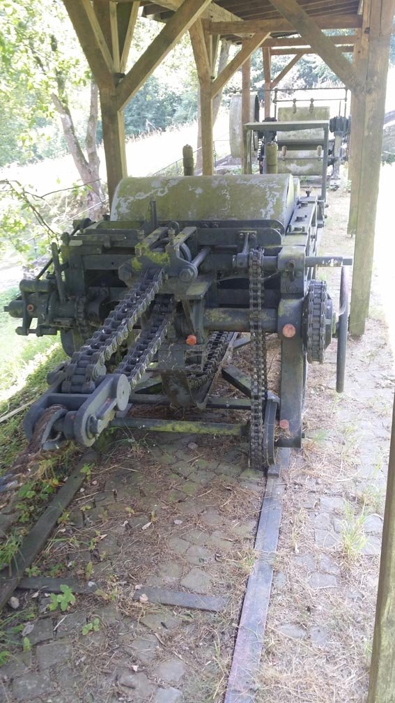 Im LWL-Freilichtmuseum in Hagen in Westfalen kann man eine historische Riemenstreckmaschine sehen, steht draußen auf Schienen.