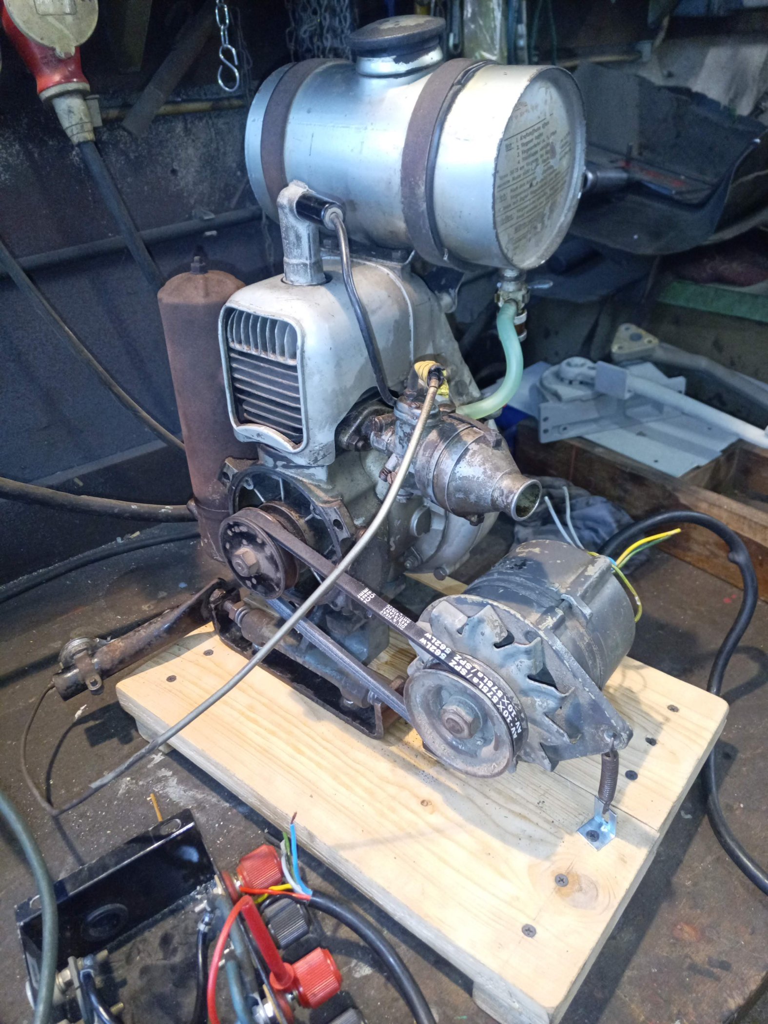 Bereits im Standgas produziert er genug Strom für einen 55 Watt Scheinwerfer. Man könnte auch eine Batterie off-grid laden um ein Fahrzeug zu starten, oder einen 230 Volt Inverter dranhängen.