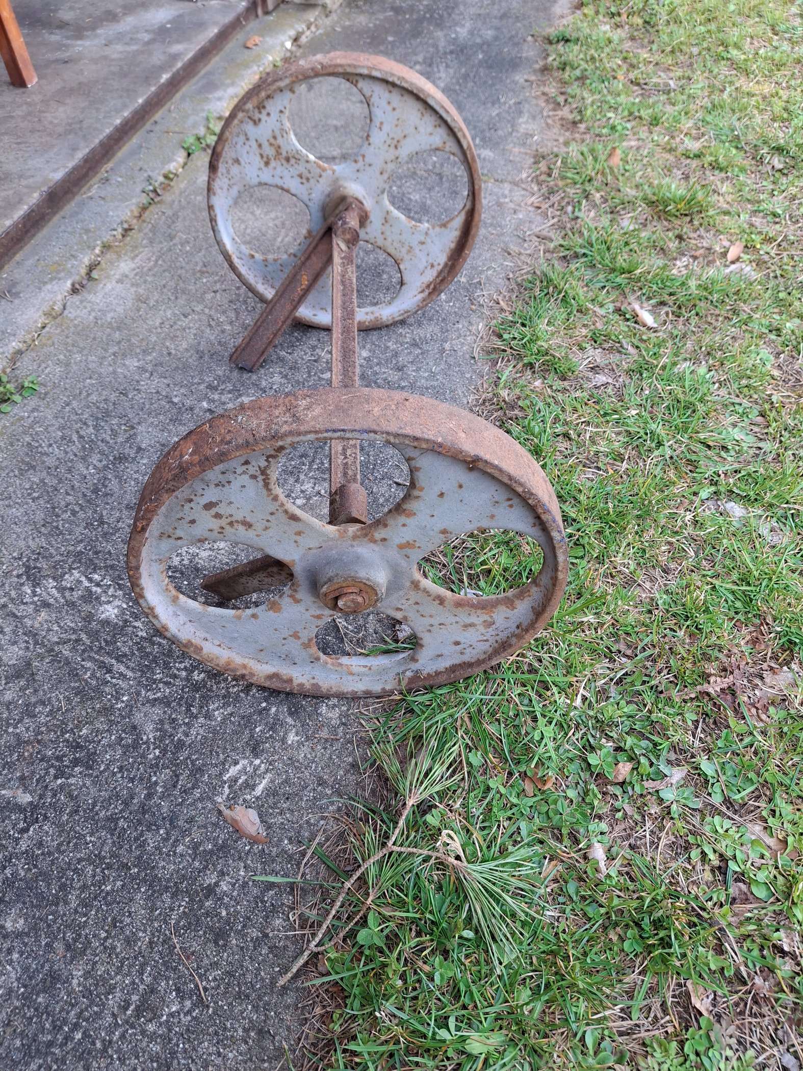 Hallo, ich biete hier zwei alte Eisenräder (ich vermute Gusseisen) mit Achse an. Durchmesser 29,5 cm.