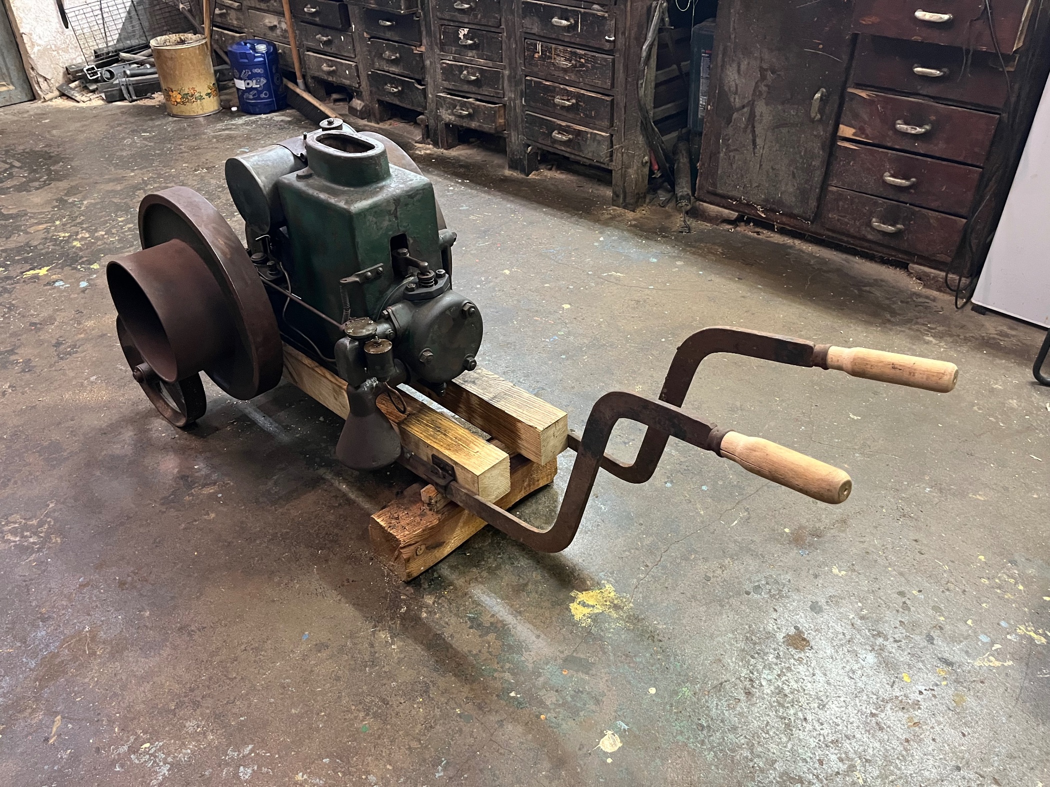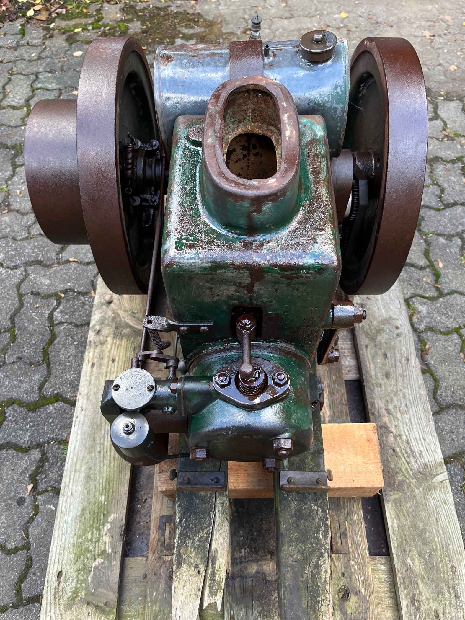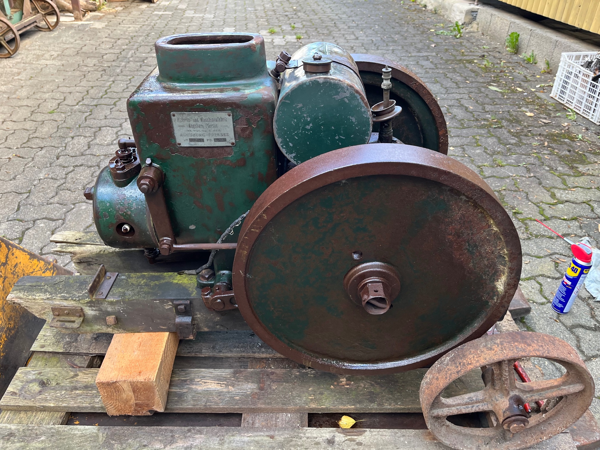 ich habe einen neuen Motor bekommen. Hersteller ist die Maschinen und Motorenfabrik Augsburg-Pfersee. Laut Typenschild hat er 3 Ps. Vom Aufbau her ist er einem Sendling SVO sehr ähnlich, wobei es aber an der Anordnung der Kipphebel und dem Zylinderkopf/Motorrumpf schon deutliche Unterschiede gibt. Es scheint also daher schon eine eigene Entwicklung zu sein.
