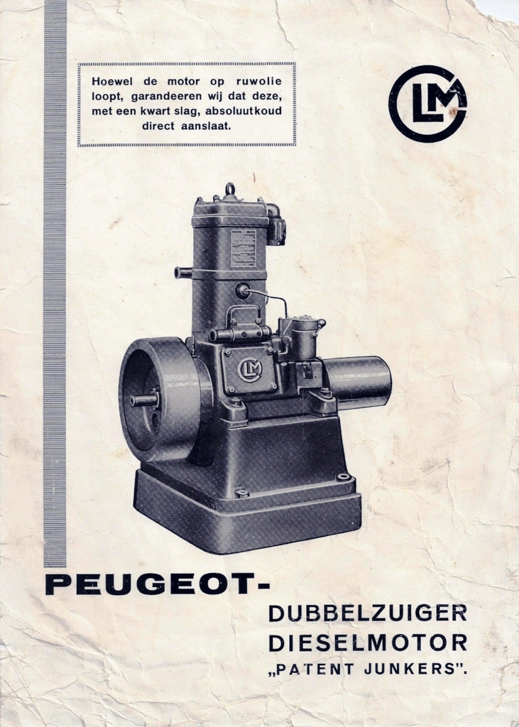 Ich würde mal auf CLM (Compagnie Lilloise de moteurs) aus Frankreich tippen. Das Schwungrad mit Schaufeln wurde bei diesen Motoren als Gebläse für den angebauten Kühler verwendet. Das sah wahrscheinlich mal so aus wie hier: