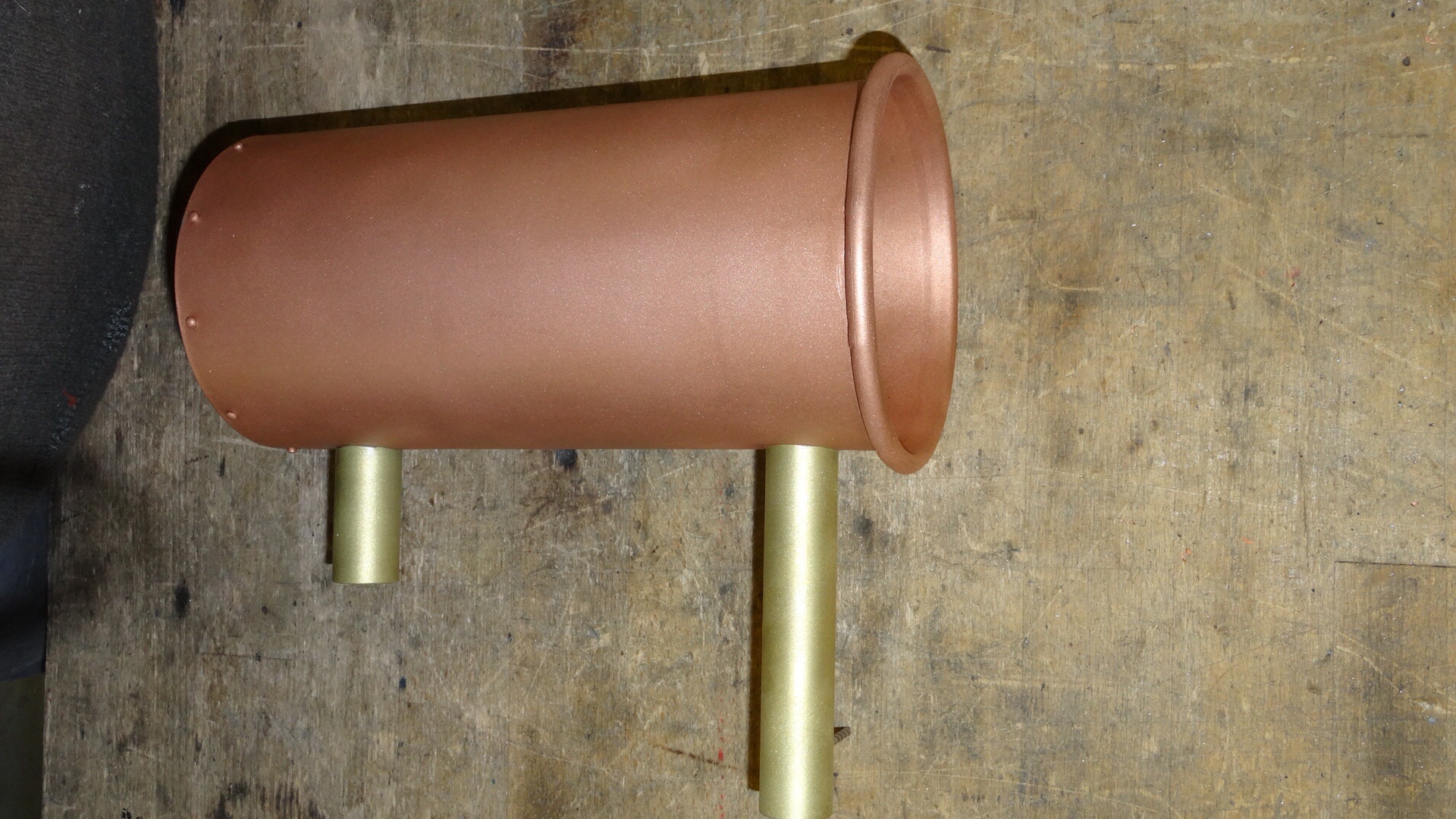 Habe meinen De Dion Bouton fast fertig. Wollte gerne einen Wasserkasten aus Kupfer nachfertigen. Leider fehlen mir die Mittel. Er sollte 120mm im Durchmesser sein, 250mm hoch und am besten einen gewölbten Deckel unten angelötet bekommen. Die beiden Löcher für Zuführung und Ableitung mach ich selber.