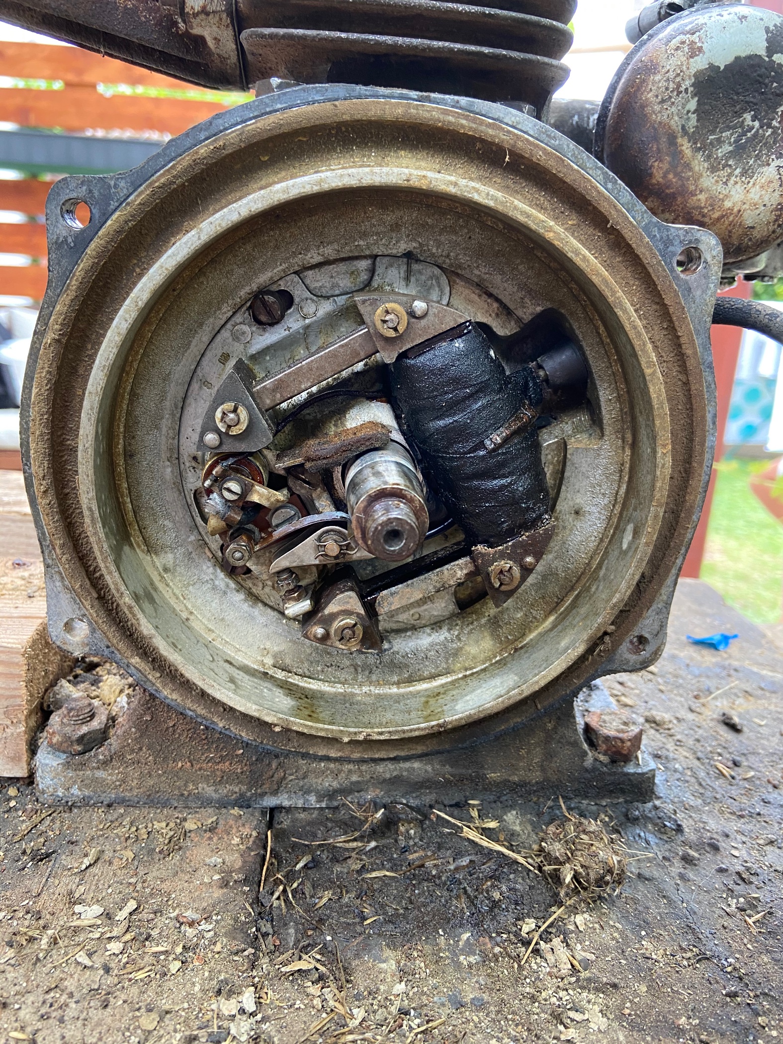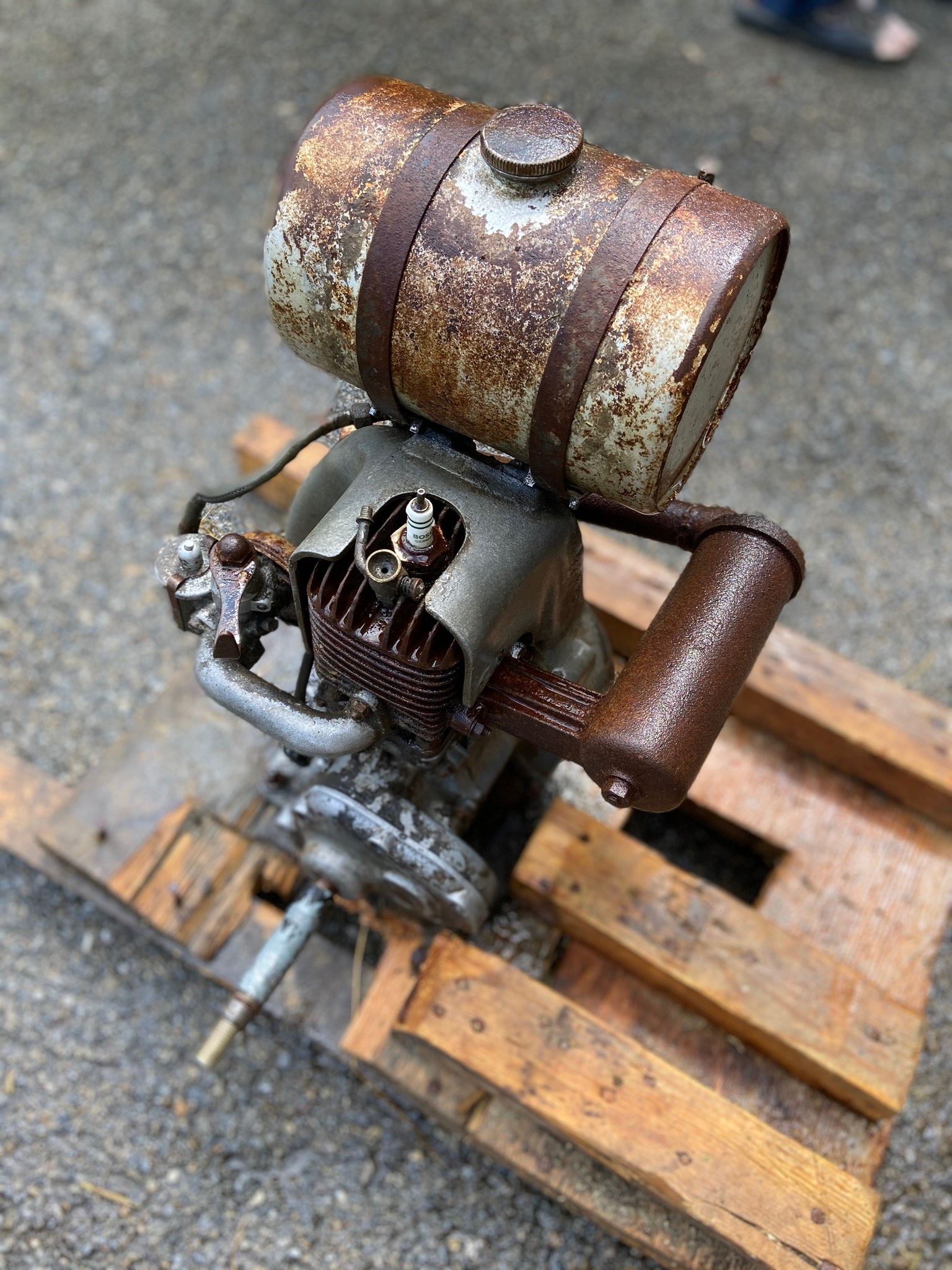 Normalerweise haben die einen Kickstarter, andere, vor allem die Flanschversion wird an der Magnetseite mit einem Gurt gestartet. Oder durch das Anbaugerät. Anbei ein Bild, wies im Getriebe aussieht. Der Hebel wirkt nicht auf das große Zahnrad, sondern auf ein kleineres dahinter. Immerhin hat deiner einen Dekohebel, damit kannst du ihn einfach auf Drehzahl bringen.