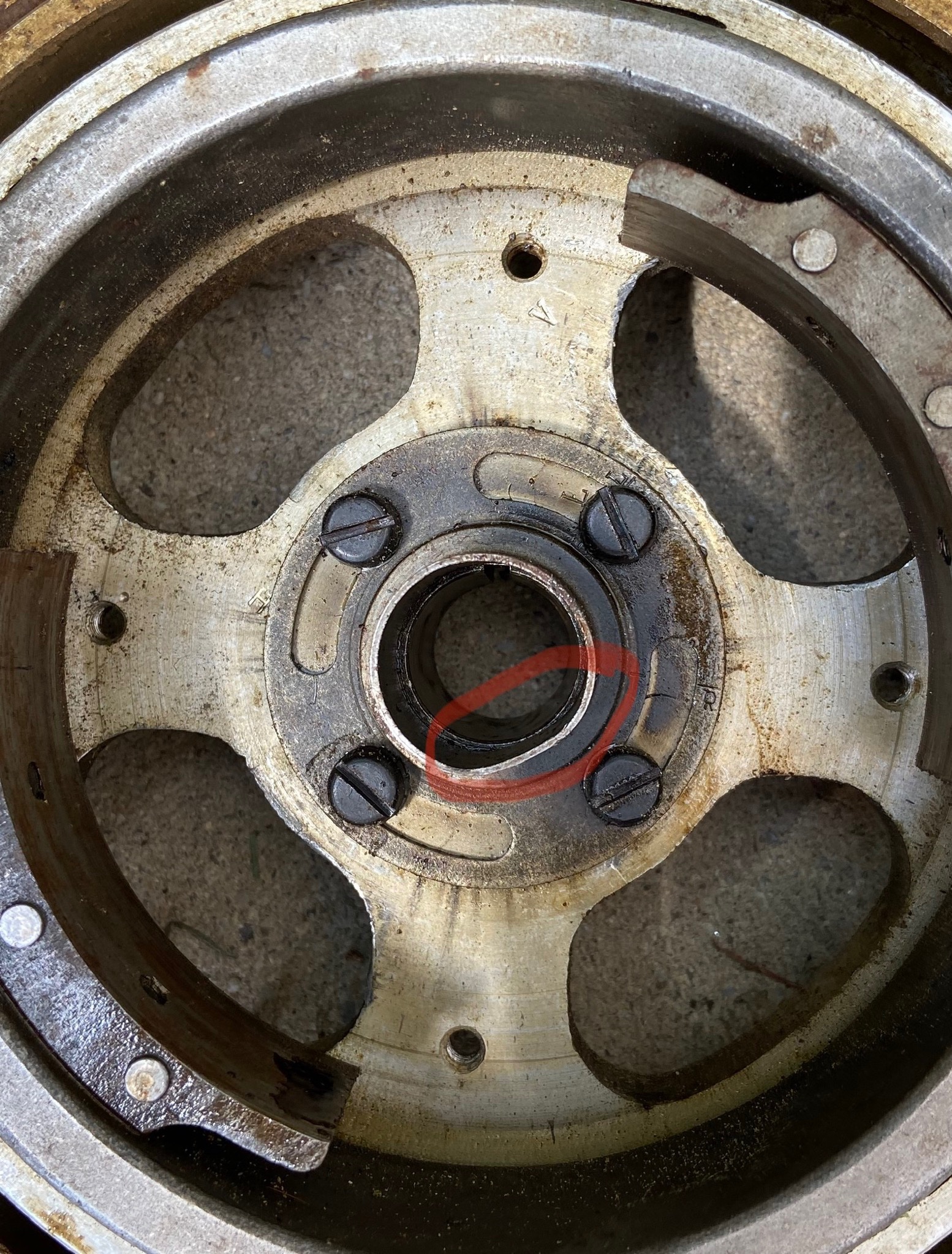 Weiters denke ich kann der Unterbrecher nicht immer geschlossen sein. Wenn man sich die Führung/Kulisse am Polrad ansieht, gibt es da eine Abflachung (s. Foto Markierung). Und nur wenn der Fieberglasstein an dieser Abflachung vorbei kommt können sich die Elektroden annähern. An sonst haben diese immer etwas Abstand. Etwas schwer zu erklären aber ich denke du weißt was ich meine 😀.