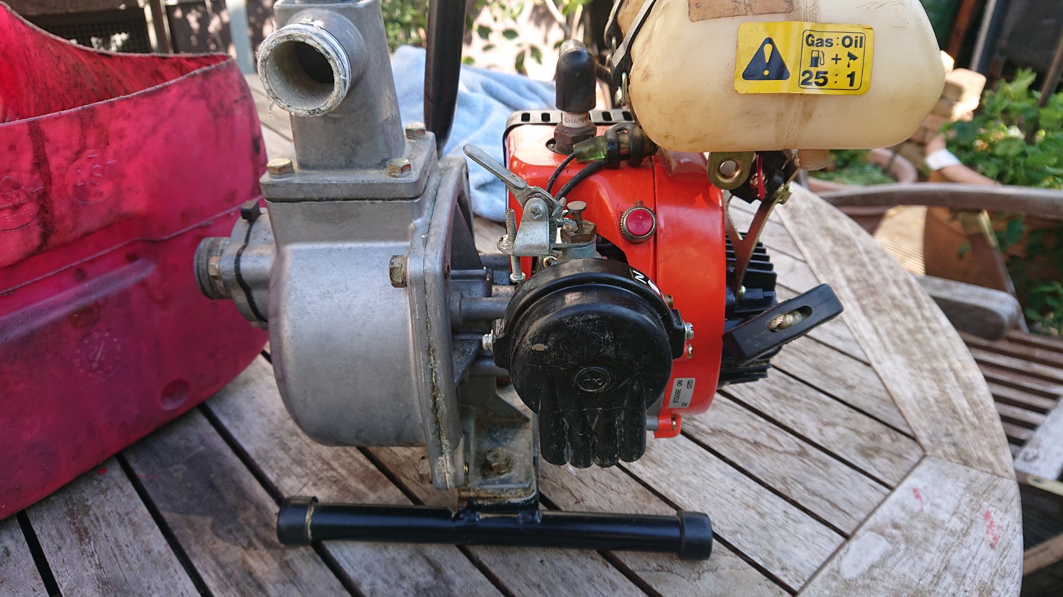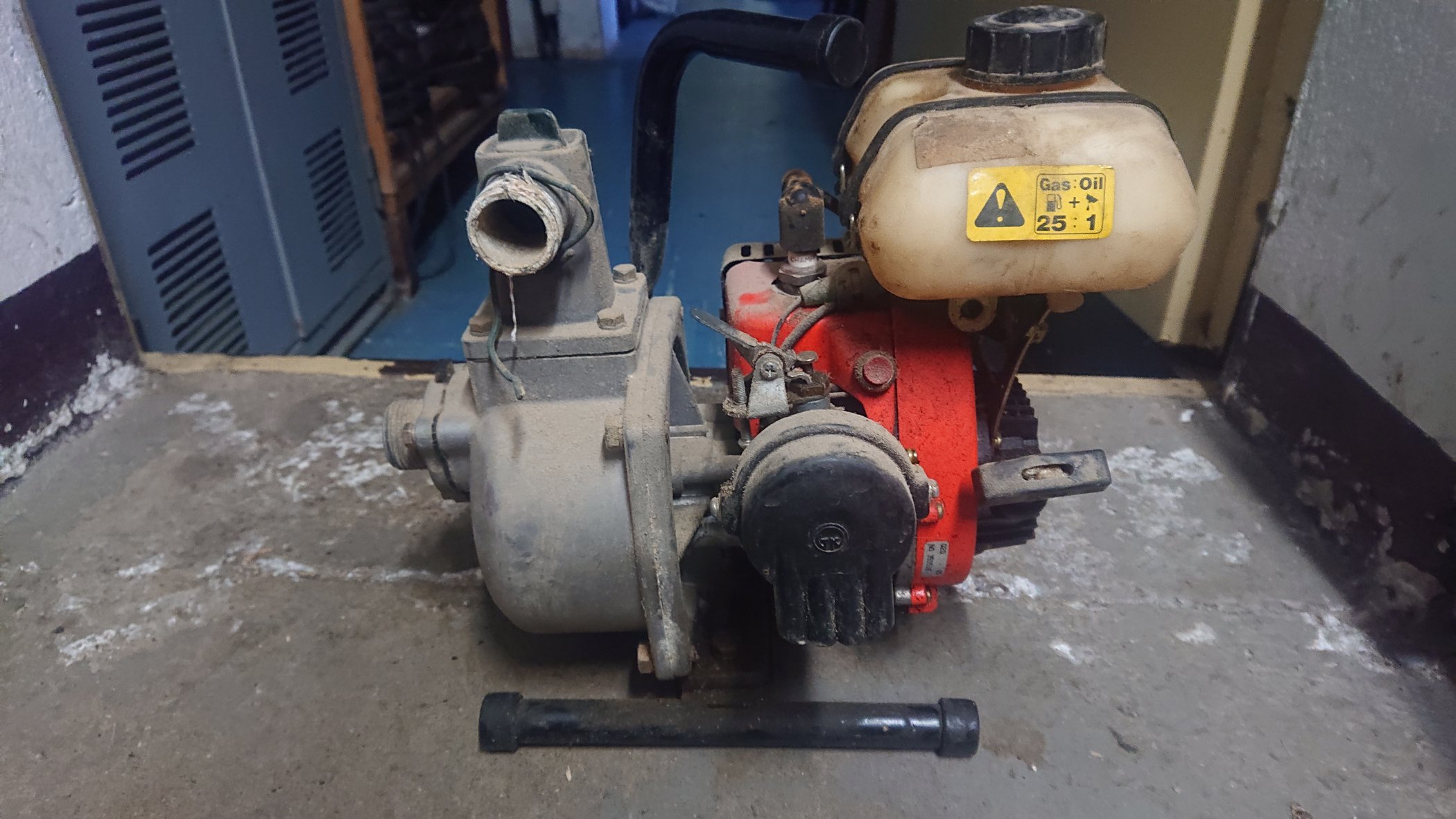 Hallo Mechanisch ist der Motor und die Pumpe in gutem Zustand. Ich habe den den Vergaser gereinigt der war komplett mit altem Öl verklebt. Der Luftfilter Schaumstoff ist auch zerbröselt. Ich habe einen neuen Filter geschnitten. Und ich habe einen neuen Anschluß für den Benzin Schlauch am Tank gedreh...