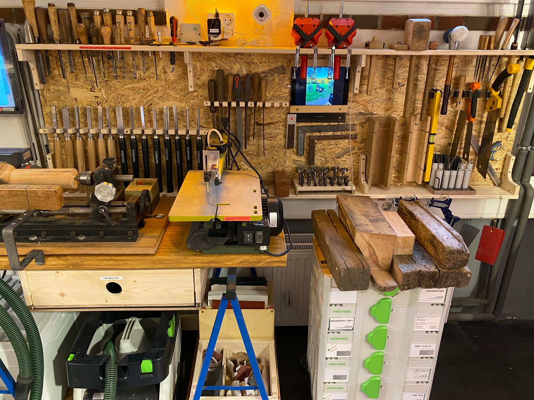 @ Schlosser 1968 . das solltest Du mal meine Holzwerkstattsehen, nichts ist schlimmer als, dauernd Werkzeug suchen, schon gar nicht beim Drechseln siehe Foto.