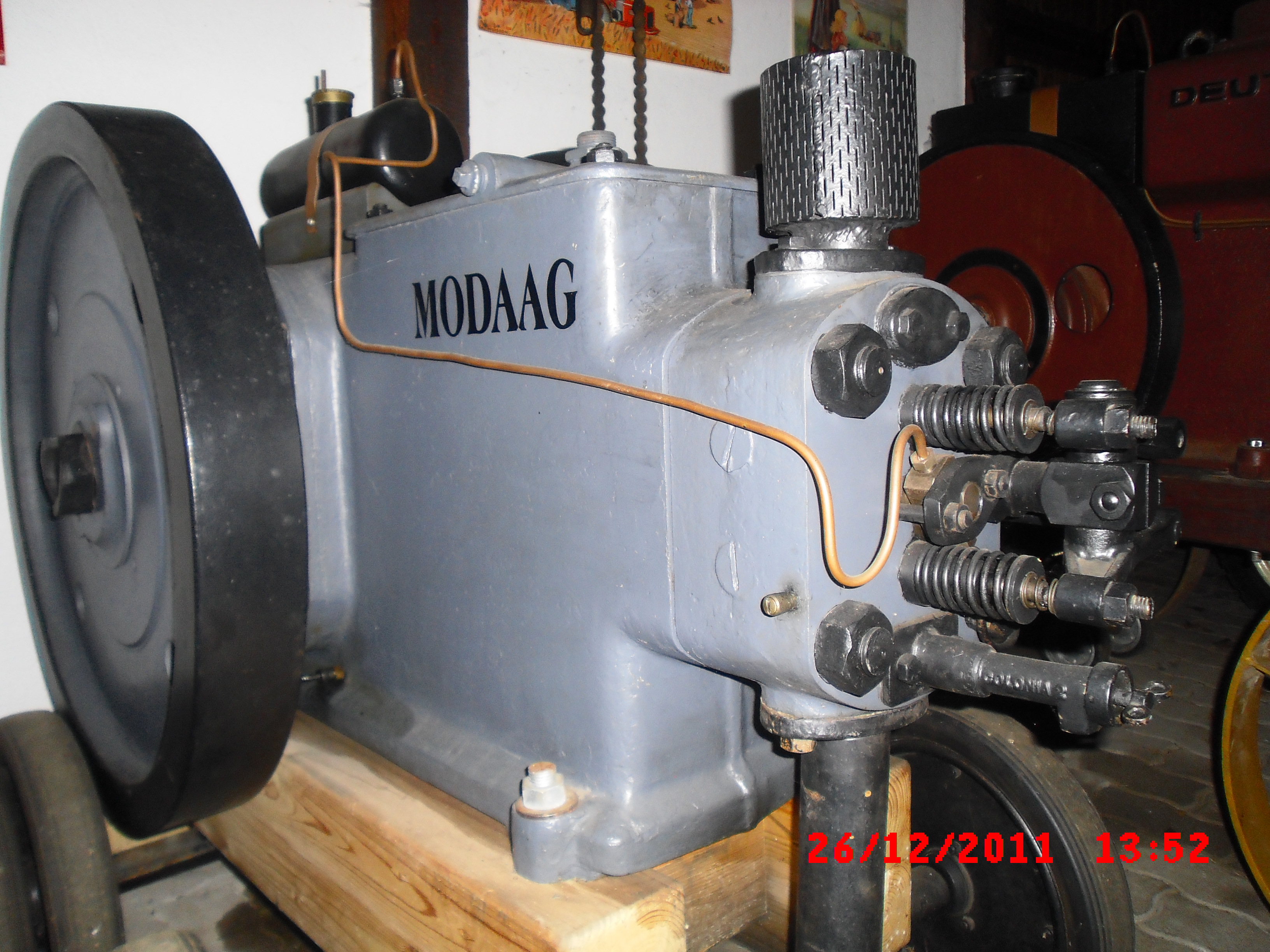 Kenne den Typ H19 nicht der bei Dir im Motorenverzeichniss steht. Du schreibst in einem anderen Thread das der Schwungraddurchmesser ca. 120 cm ist. Ich würde dann auf einen D4 tippen. Bei einem Schwungraddurchmesser 135 cm sollte es ein D5 sein. (alte kopierte Unterlagen von Modaag mit vielen Maßen) Bei meinem Modaag steht die Typenbezeichnung auf der Einlaß bzw. auf der Auslaßnocke.