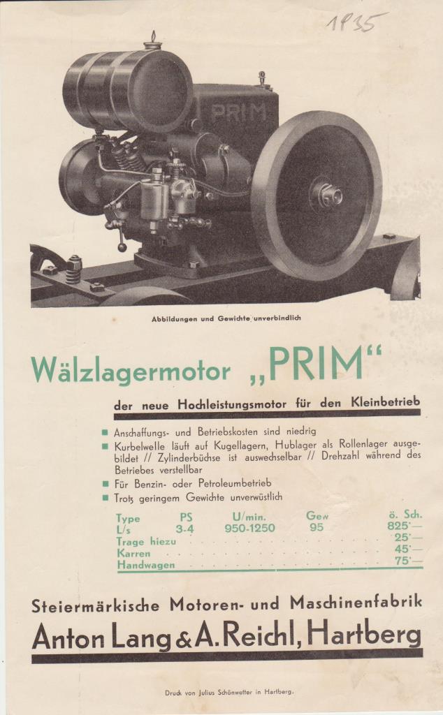 Der Primus ist von Lang u. Reichl aus der Steiermark, den Schreiben zu entnehmen hat man den 3-4 PS 1935 dann Prim genannt