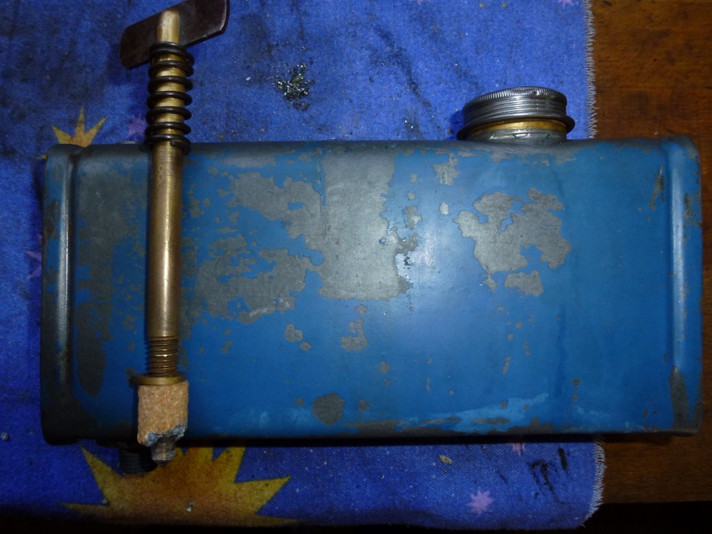 Du hast wohl die Kriegsausführung aus Zinkguss erwischt. Irgendwann zerbröselt die Zinkpest das Ventil. Ich kann Dir einen Tank anbieten, der über einen Messing-Einsatz verfügt. Ich habe die Farbe ein bisschen abgeürstet, da kann man sehen, dass das Ventil eingelötet ist. Man kann es also eventuell auch auslöten und reparieren. Ob mein Tank an Deinen WS304 passt, weiss ich nicht, aber die Maße kannst Du dem Bild entnehmen. Er ist besser erhalten als er aussieht. Leider wurde er mit dicker brauner Farbe überpinselt, was ihn darunter aber gut konserviert hat. Er hat keine Durchrostungen. Bei Interesse schreib mir eine PN.