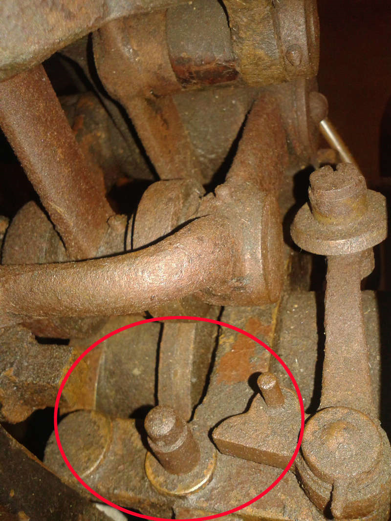 Der Betätigungshebel der Pumpe war auf demselben Bolzen gelagert, wie der Schlepphebel der Auslass-Stößelstange. (Die Fettbüchse dient übrigens zur Schmierung des Kolbenbolzens.)