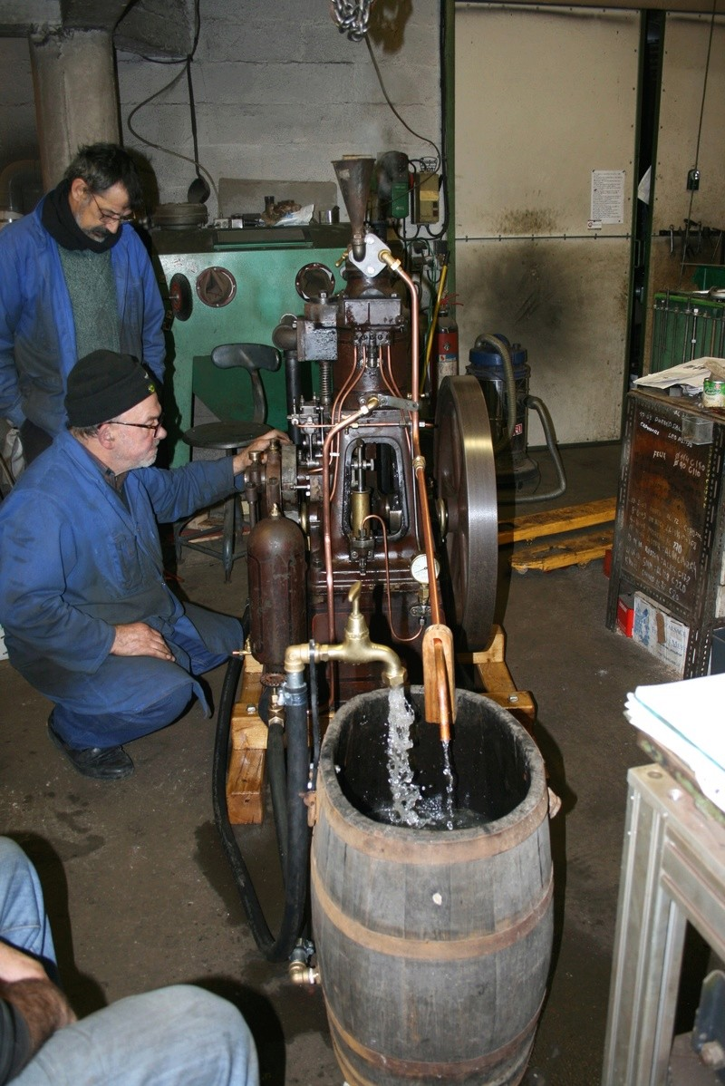 Noch ein paar Bilder vom fertigen Motor. Der Kühlwasserkreislauf des Motors zweigt von der großen Wasserpumpe ein wenig ab, geht unten in den Zylinder und tritt oben am Einlassventil auf dem Zylinderkopf wieder aus. Das meinste Wasser wird nur von der Pumpe im Kreis herum gepumpt. Als Kühlwasserbehälter dient eine "Basse" (französisches Wort), bei uns am Bodensee sagt man "Butte" dazu. Diese Gefäße haben normalerweise zwei Träger aus Leder und werden bei der Weinlese in steilen Lagen auf den Rücken geschnallt, um die Trauben zur Sammelstelle oben oder unten am Hang zu tragen.