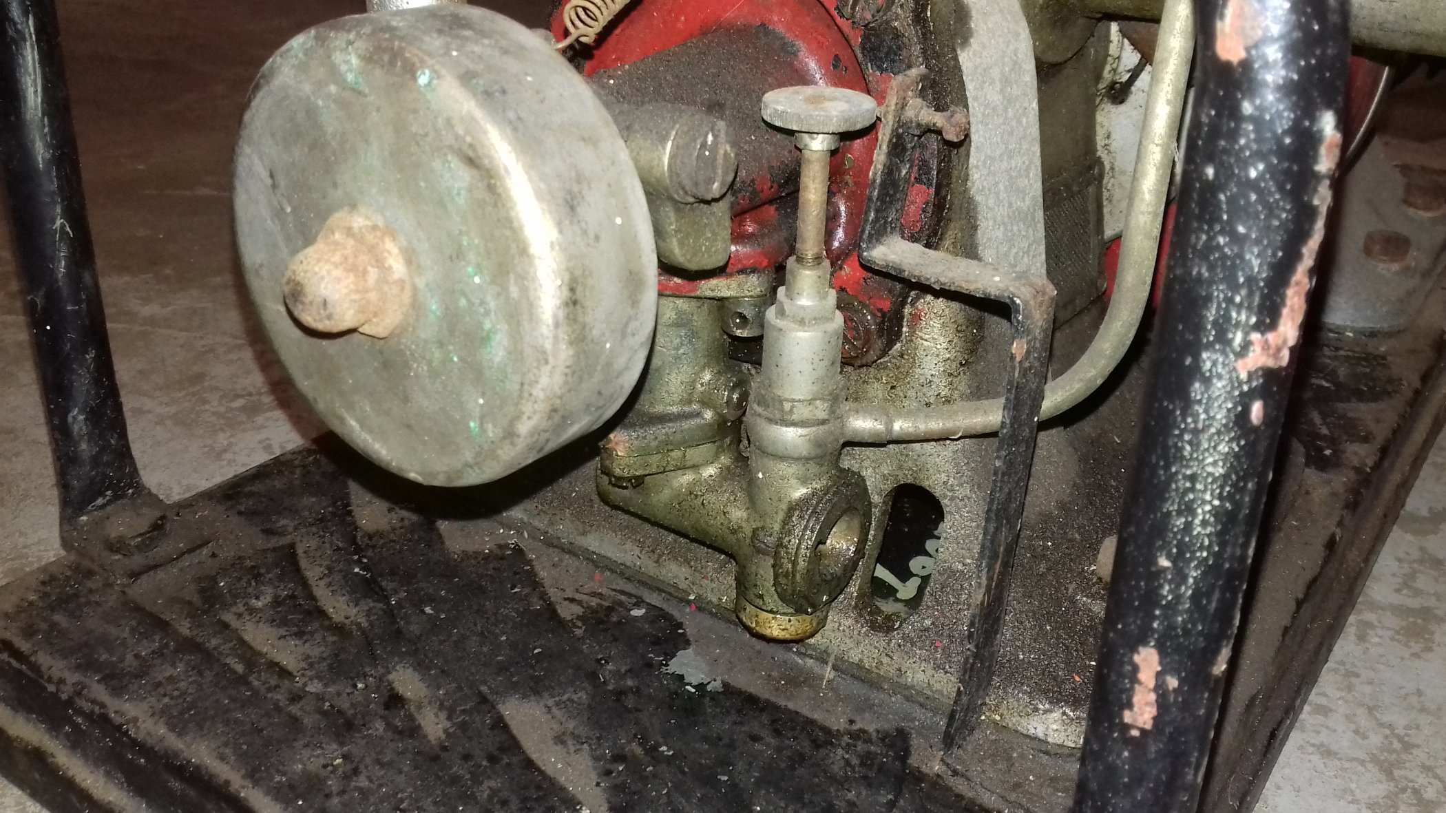 Der motor wird angekurbeld an die welle der flagriemenscheibe! Und hat einen vergaser ohne schwimmergehäuse, nur eine düse. Sieht aus als ob der zilinderkopf mit gewinde im zilinder geschraubt ist.