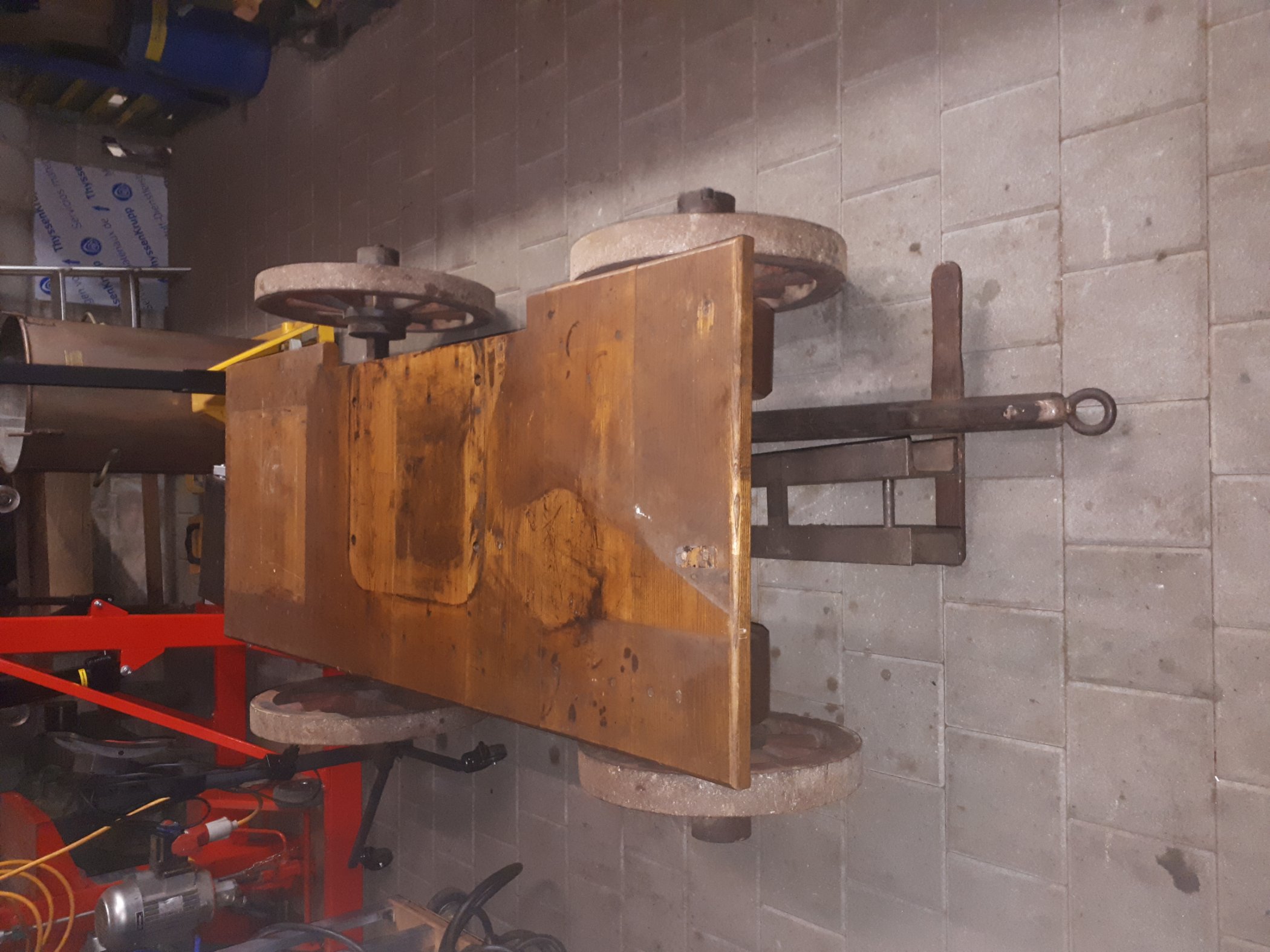 Dann noch die Position des Aublaufsrohrs ausmessen, auf dem Wagen angezeichnet und ein Loch von Durchmesser 60 mm. Gebohrt, den Motor nochmals angehoben, auf den Wagen gesetzt und festgeschraubt.