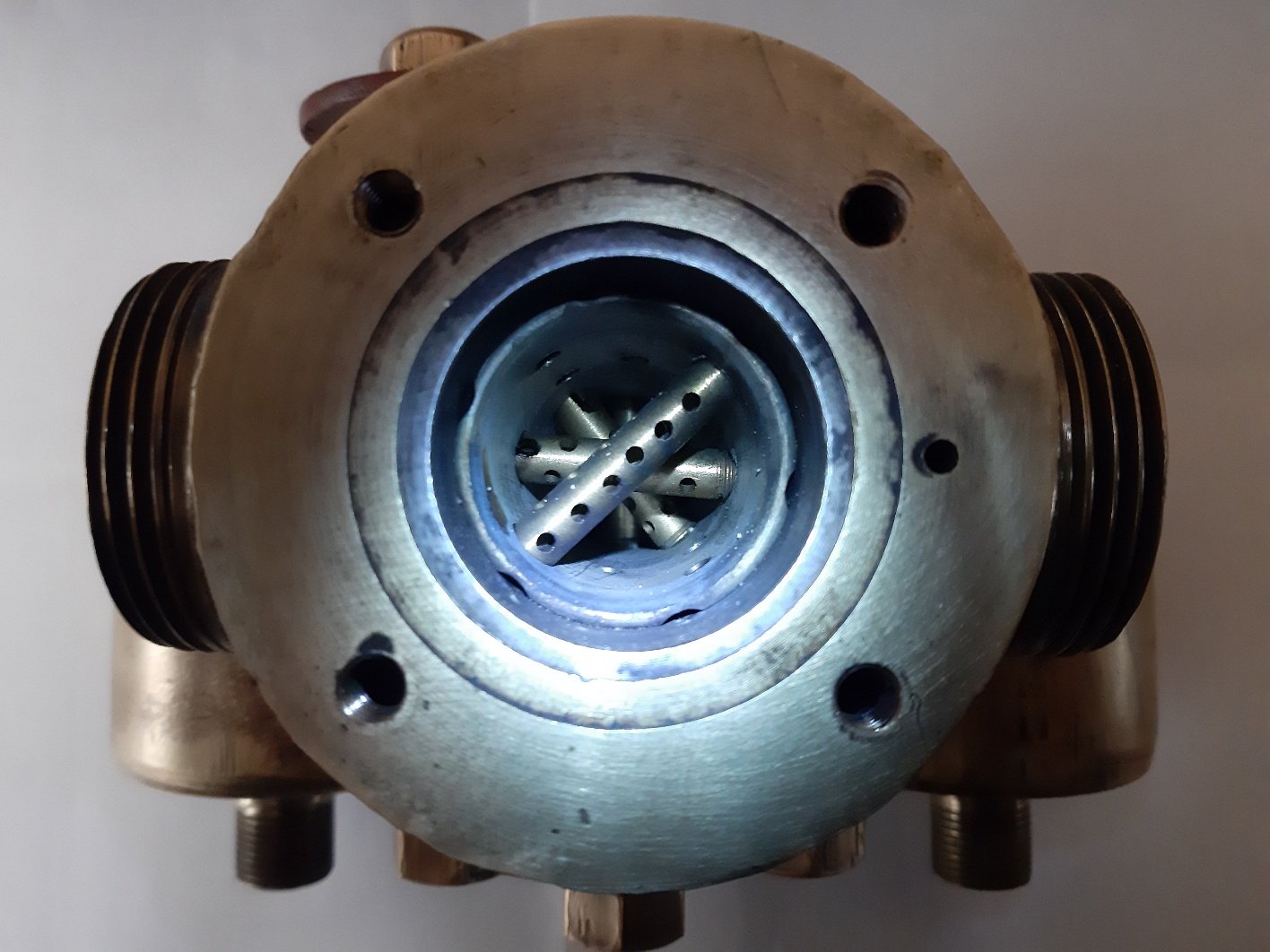 Moin, so was ist mir neu - die beiden unter 45° liegenden Düsen könnten jeweils zur linken bzw rechten kammer gehen und wären absperrbar. was macht die waagerecht liegende Düse zwischen den beiden äußeren Gewindestutzen? Übergangsdüse beim Umschalten? Mischbetrieb??