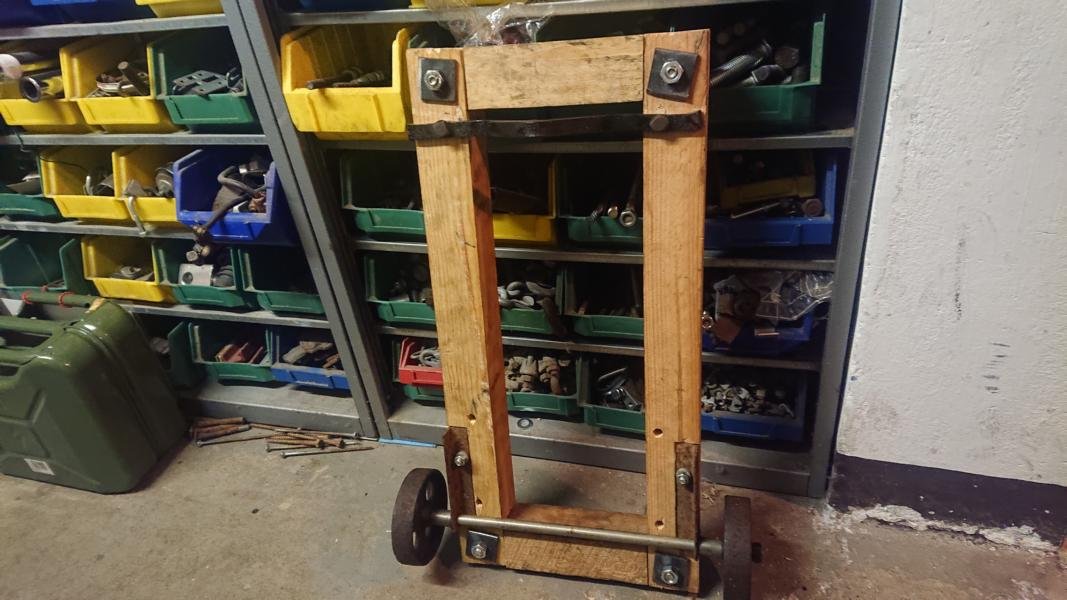 Ich habe für den Wagen für die Säge einen Rahmen aus Holz gebaut. Die für die Räder habe ich eine neue Achse angefertigt und die Halter in das Holz eingelassen.Und für die andere Seite habe ich das gute Wetter am Freitag genutzt und ein bisschen Feuer gemacht und einen Fuß geschmiedet.
