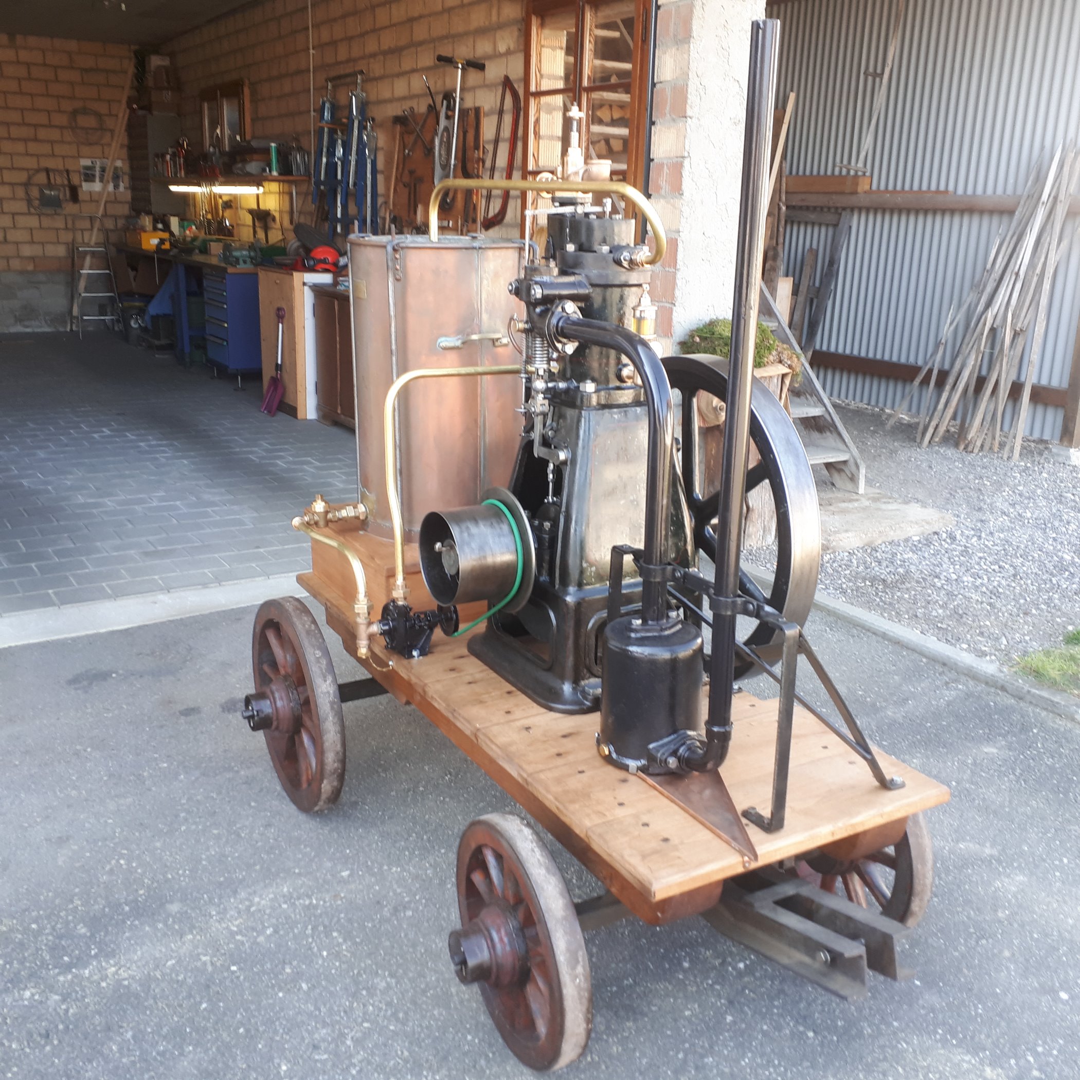 die ich nur geringfügig umbauen muss neben dem Motor auf dem Wagen. Auf dem Anschluss für die Kraftstoffleitung am Ölventil montiere ich ein Schauglas von welchem das Ölventil und der Brenner für das Glührohr mit Petrol versorgt werden.