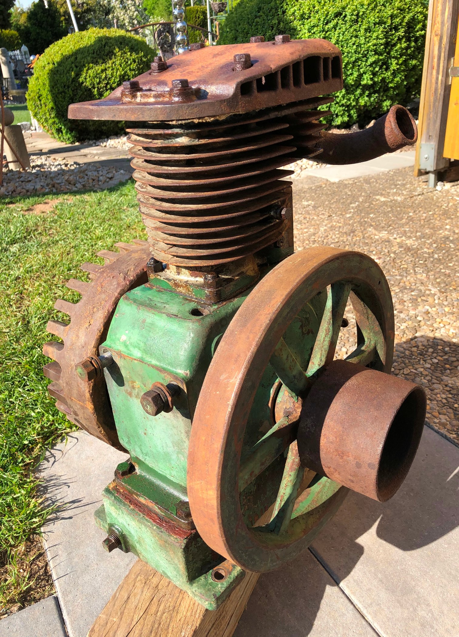 Die Bauform ,Zylinderkopf ,Regelgestänge,Motorensockel usw sind ähnlich Wisconsin air cooled. Jedoch ist das Luftleitblech wieder zu eckig,vielleicht nach gefertigt. Ob das Speichenschwungrad original ist ?? Wenn du die Schwungscheibe mit den "Luftschaufeln" abnimmst wäre dann eine Schwungradmagnetzündung verbaut!?