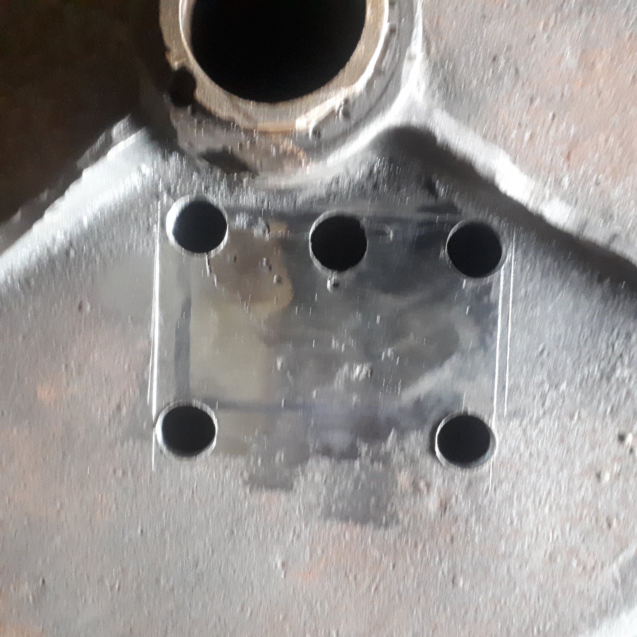 So nun bin ich es wieder. Hab den Motor inzwischen in meinen Händen. Entgegen der Hoffnung, dass es mit dem auf den Fotos erkennbaren und überlackierten Schäden nicht so schlimm ist, ist es nach Abschleifen von Farbe und Spachtel leider doch schlimmer, als vermutet. Sieht ganz so aus, als hätte der Motor mal einen Frostschaden gehabt.