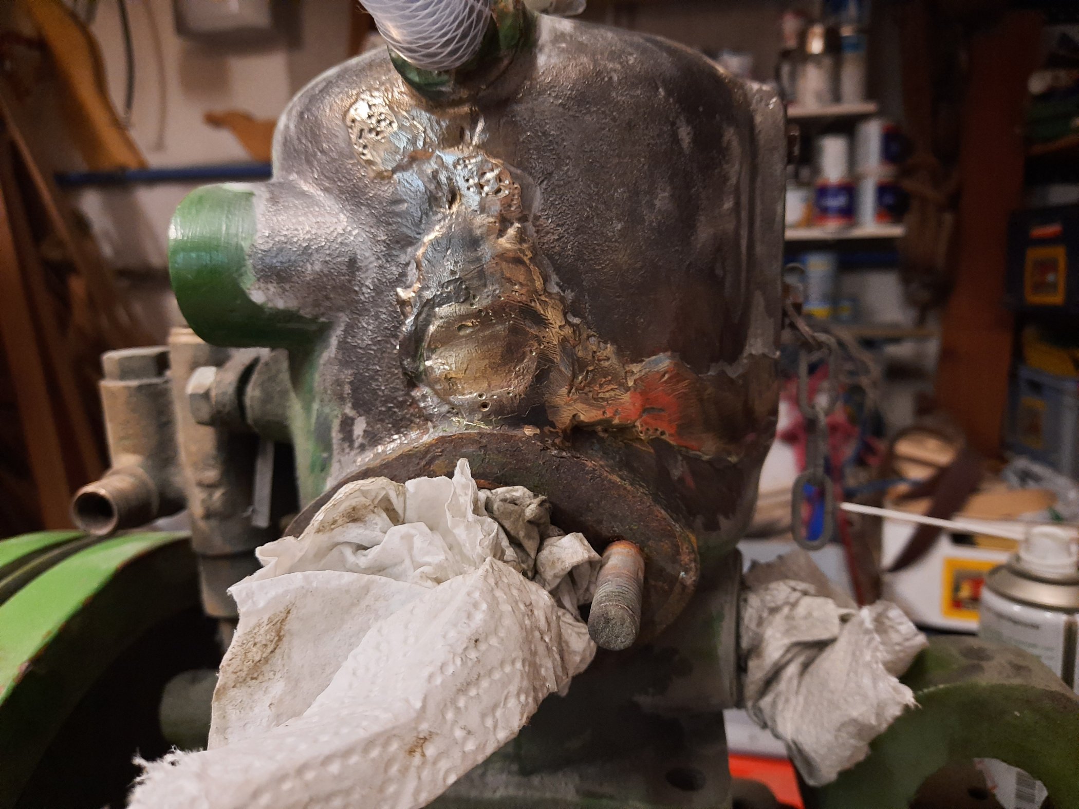 Auf dem beigefügten Foto kann man über der Auspufföffnung einen in etwas dunklerem Grün gestrichenen Bereich erkennen. Dieser Bereich (wassergekühlter Zylinderkopf) scheint mal repariert worden zu sein. Ich vermute, dass da der Motor vielleicht einen Frostschaden hat und dass man den Riß oder das Loch mit einer Metallreparaturmasse abgedichtet hat (konnte noch nicht selber daran rumprokeln). Frage wäre in diesem Fall: Kann man so ein Gussgehäuse schweissen, falls es sich um einen Riß handelt oder kann man die Stelle ausarbeiten und ein passendes Stück Blech einschweissen (falls es ein größerer Schaden ist)?