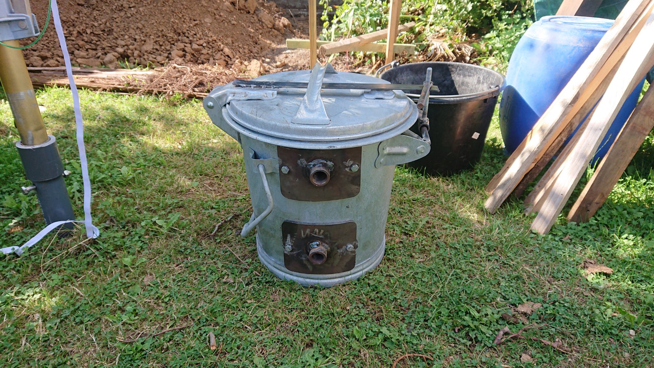 Ich habe heute den neuen Feinfilter und wie gut der Petter mit dem Holzkohle Vergaser läuft getestet. Der Filter ist mit Holbelspänen gefüllt. In dem Grobfilter befindet sich Kies wo der Grobe Dreck hängen bleibt und als Rückschlagsicherung dient.