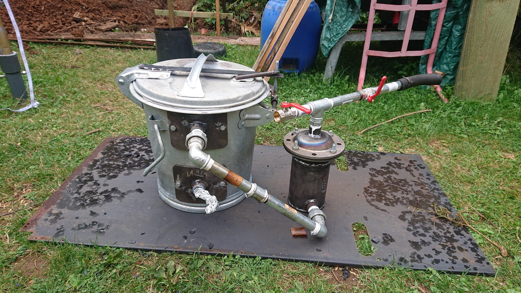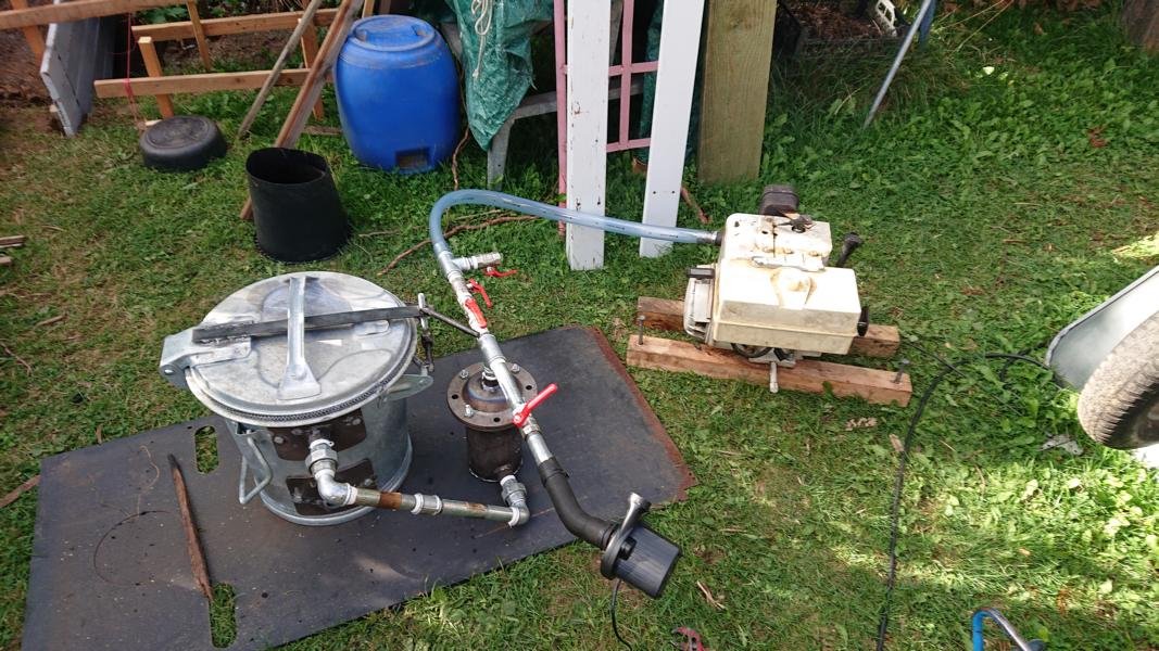 Der Holzkohle Vergaser läuft. Der Vergaser ist nicht wirklich sehr zuverlässig und ich habe lange gebraucht bis ich die Einstellung gefunden habe bis der Motor läuft. Und die Filterung und Kühlung muss ich noch verbessern weil ich habe noch viel Feuchtigkeit im Gas. Den Fein Filter muss ich auch noch mal besser machen weil mein Filter war schon beim Anheizen verstopft und für einen kurzen Probelauf habe ich die Anlage nur mit dem Grobfilter laufen lassen.