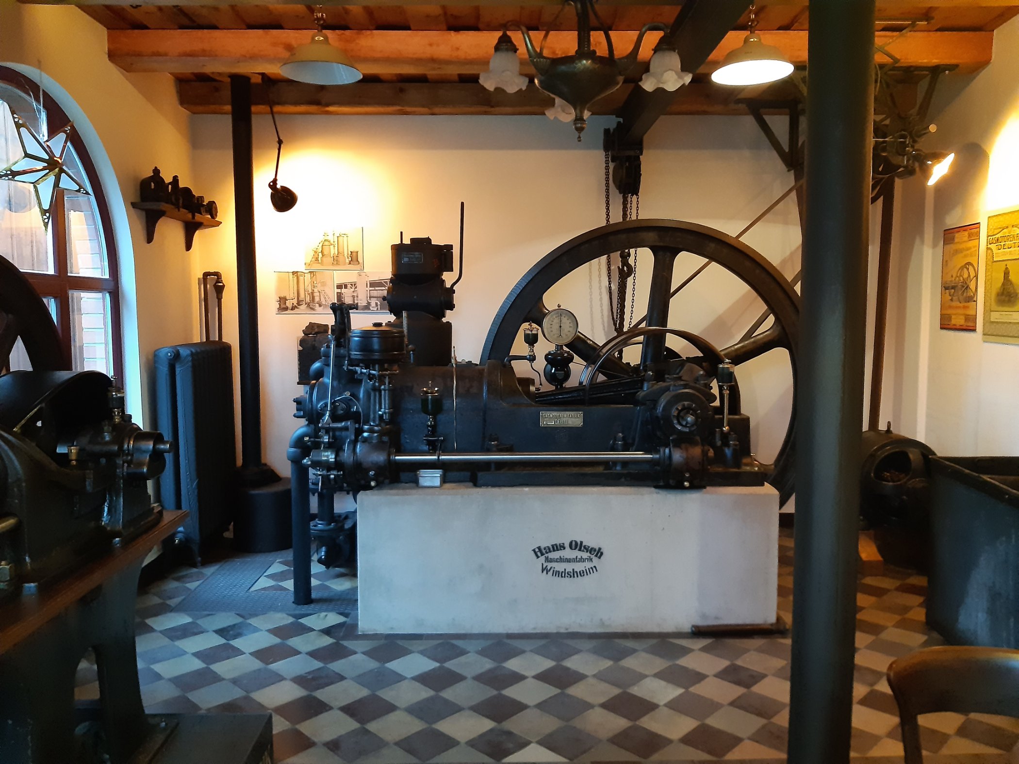 Der Motor stammt aus einer alten Mühle hier in Bad Windsheim . Ich glaube aber nicht mehr das dieser Motor noch läuft , da es nur ein Schauobjekt noch ist . Es ist ein Elektromotor angebaut , so das man den Motor noch drehen sehen kann . Nur die Steuerung klappt nicht mehr. Ich habe einige Bilder dazu.