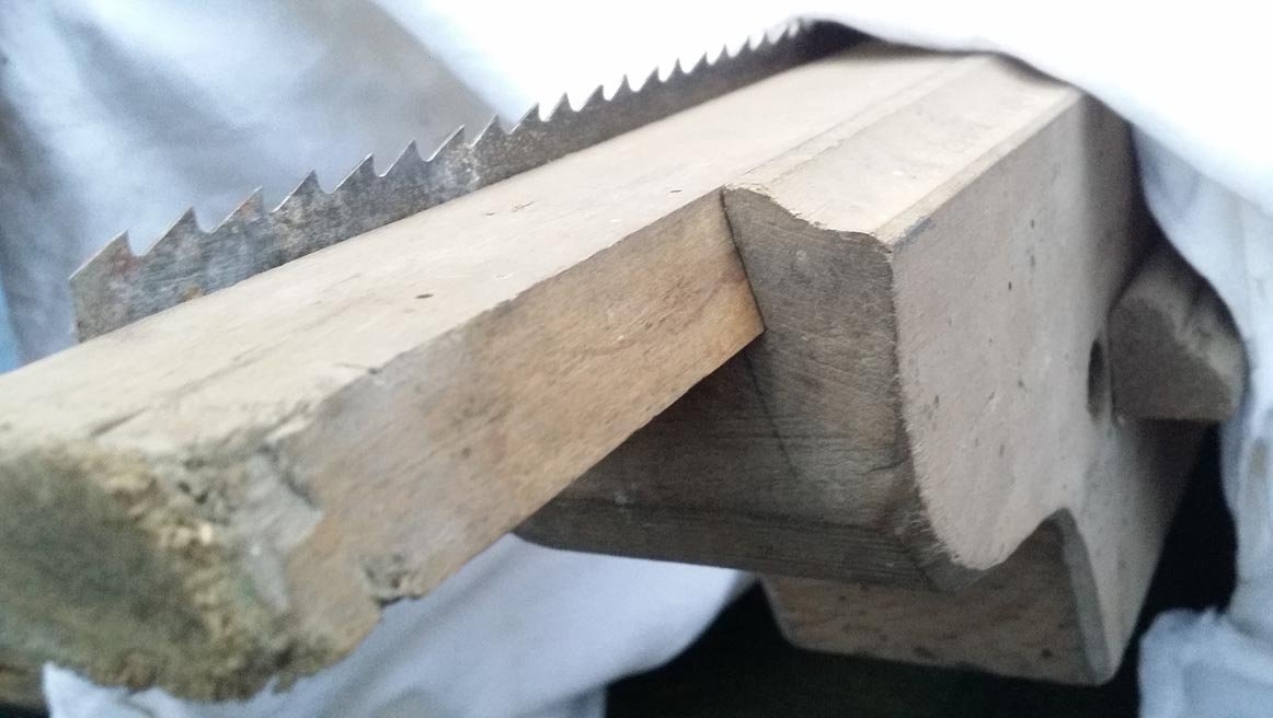 Wenn man so etwa 1931 (das Baujahr der dort gezeigten Bandsäge) und die Jahrzehnte danach ein Bandsägeblatt schäfen wollte, hat man sich eine Vorrichtung aus gedämpfter Rotbuche gebaut.