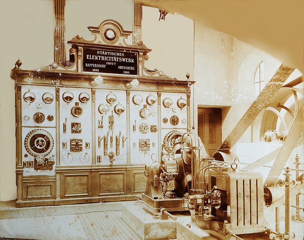 Laut Stadt Abensberg ist das alte E-Werk in Rappersdorf abgebaut und das neue in Abensberg um 1900 gebaut worden,deshalb die beiden Daten über der Schalttafel.