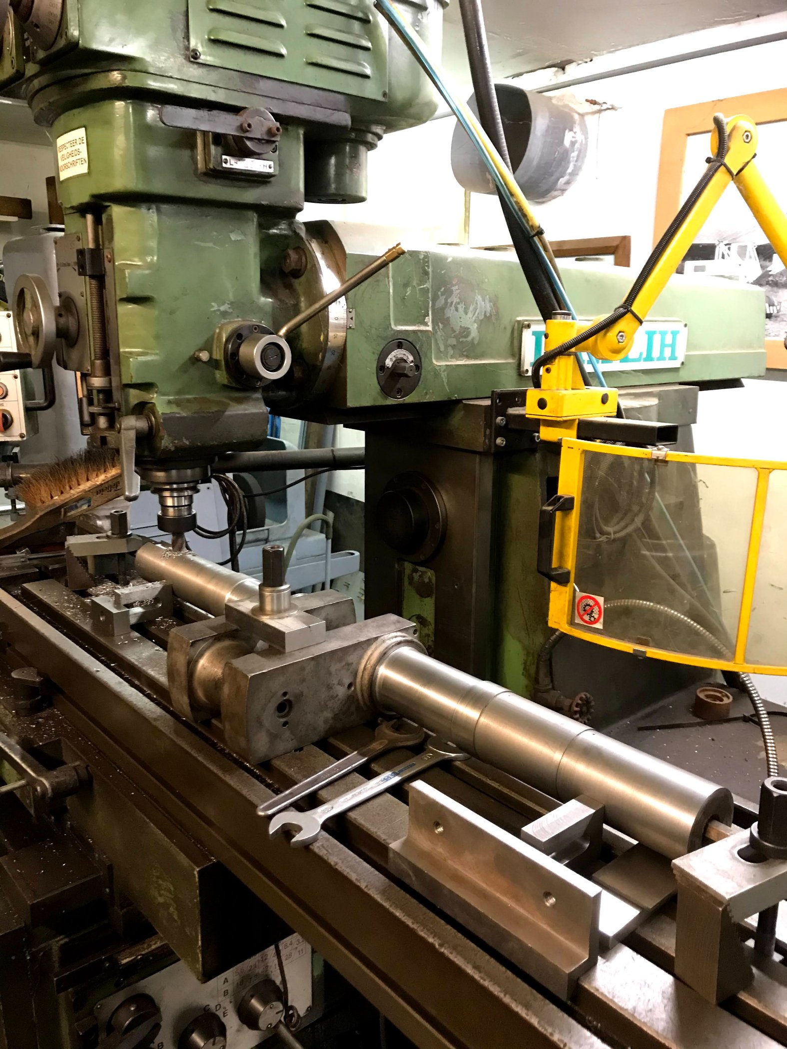 Die Kurbelwelle war in einen sehr schlechten Zustand, wie auch in die Bilder hier oben zu sehen ist. Die Schwungräder müss wohl mehrmals lose gekommen sein da die beiden Keilnuten völlig ausgeschlagen waren. Es wurden verschiedene mögliche Lösungen untersucht und mit Rik besprochen, und am Ende habe ich mich entschlossen für eine Lösung die ich selber ausführen konnte. Zuerst wurden die Keilnuten gefüllt mit 2-K Plastikmetall, danach habe ich die Welle abgedreht in 3 Stufen. Dann wurden Buchsen verklebt (diese hatte ich schon vorbereitet und die Wellen um 0,08 mm kleiner abgedreht). Nach Verklebung konnte ich dann die Aussendurchmesser wieder bearbeiten. Diese sind wieder wir original, nur die Lagerflächen sind 60mm in Durchmesser so dass die Lagerschalen ausgebohrt werden können und wieder rund werden. Das wird er nächster Schritt sein, erst noch einige Bilder!