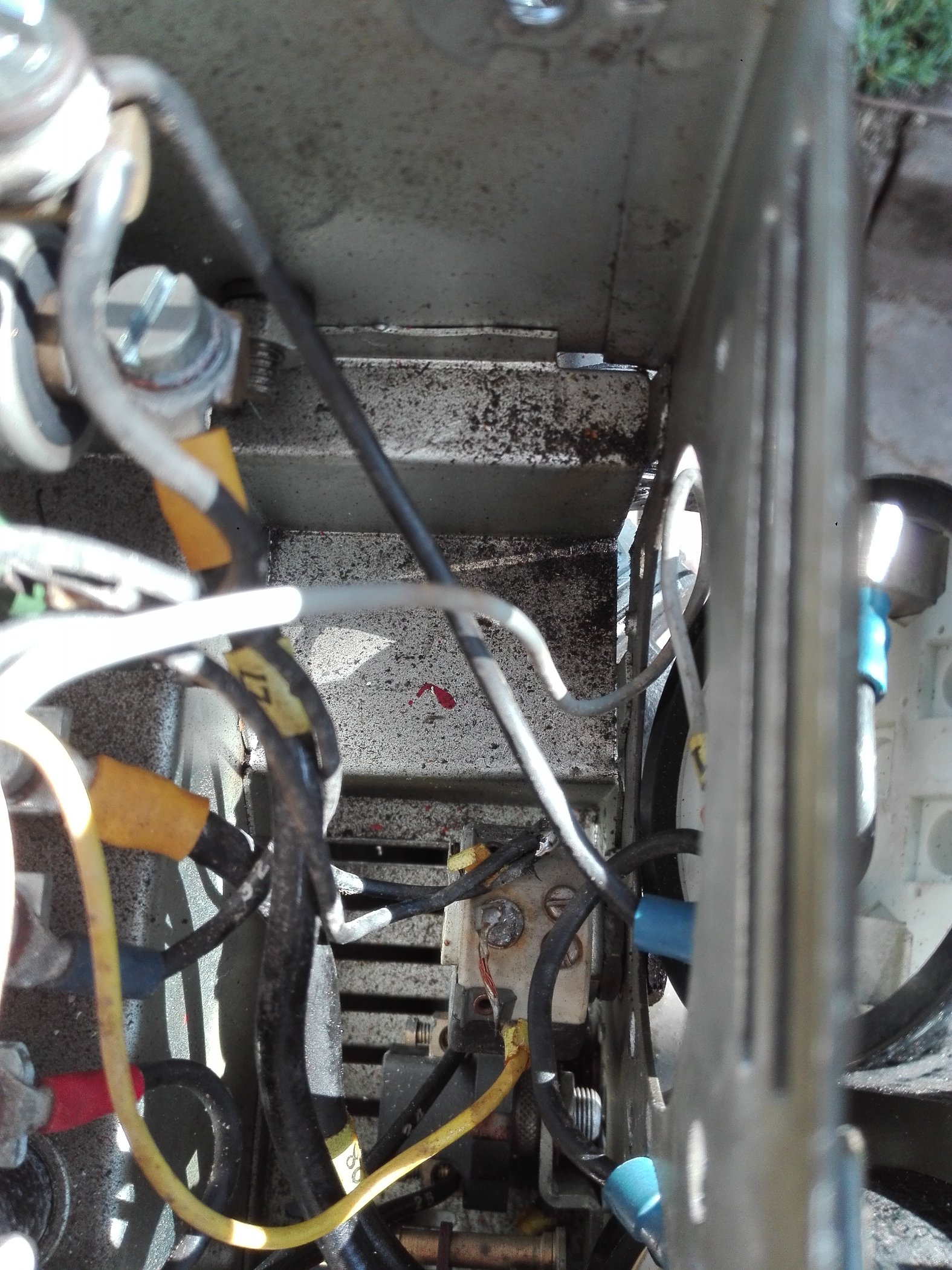 Es sind da insgesamt drei Widerstände zu finden, einmal der ganz lange, oben querliegende, mit den verschiedenen Schellen zum Abgriff (sind das vielleicht die verschiedenen Regelwiderstände für die Feldwicklung zur Einstellung der Spannungen ?) dran und dann noch zwei kleine stehende, links und rechts vor dem Regler, da schaue ich mal.