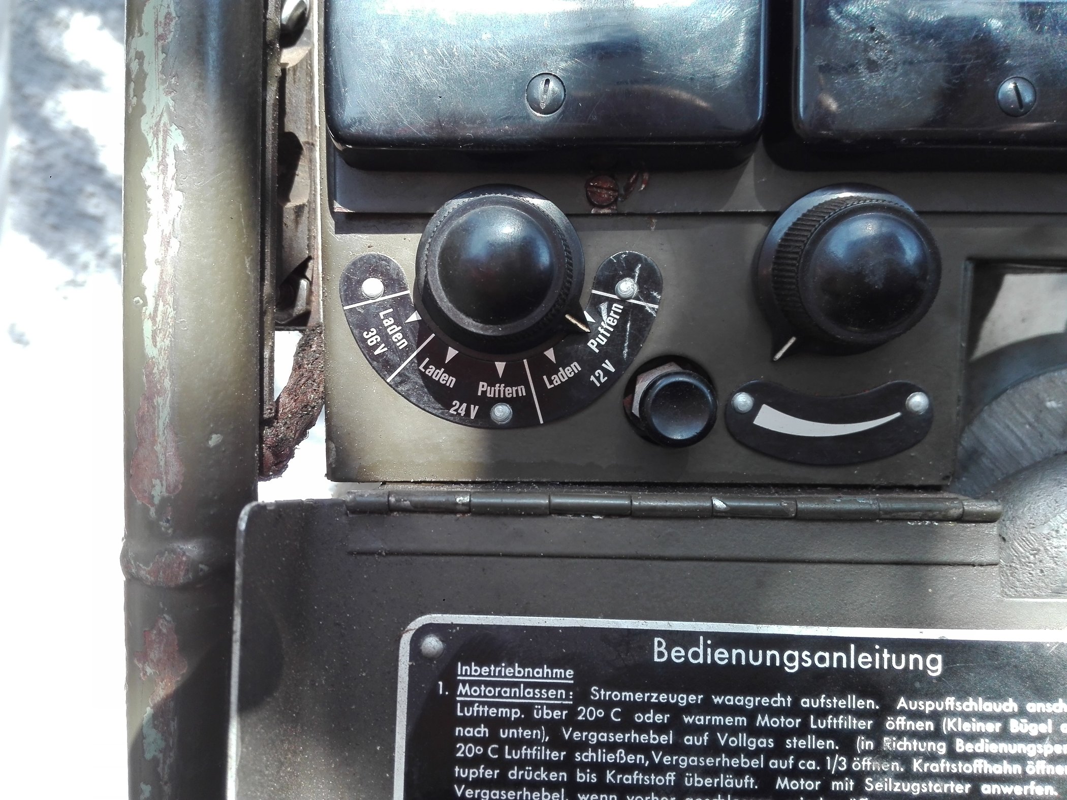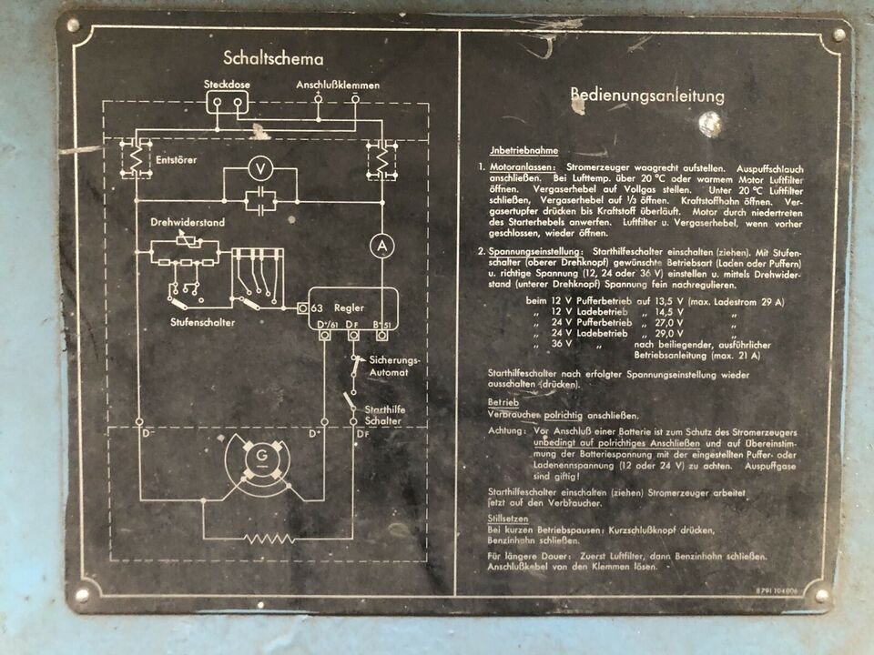 Man kann damit Batterien laden und puffern, also z.B. trotz Funkbetrieb die Fahrzeugbatterie auf Spannung halten. Es funtkioniert aber nur die Stellung "Puffern 12 Volt", wobei der Generator quietscht, als wäre er überlastet, die Spannung läßt sich korrekt einstellen, ca. 5 A Ladestrom sind auch ok, je nach Batteriezustand. Schalte ich auf 12 V laden, geht die Spannung auf über 20 V, der Ladestrom auf über 10 A und der Generator quietscht noch lauter, als wäre er kurz vorm Exitus. Schalte ich weiter auf die Stellungen für 24 oder 36 Volt ändert sich an den Anzeigen nichts mehr, sie bleiben so und es quietscht. Das Quietschen ist kein Lagerschaden, man kann nämlich mit einem kleinen Zugschalter die Feldwicklung unterbrechen und dann hört es sofort auf.