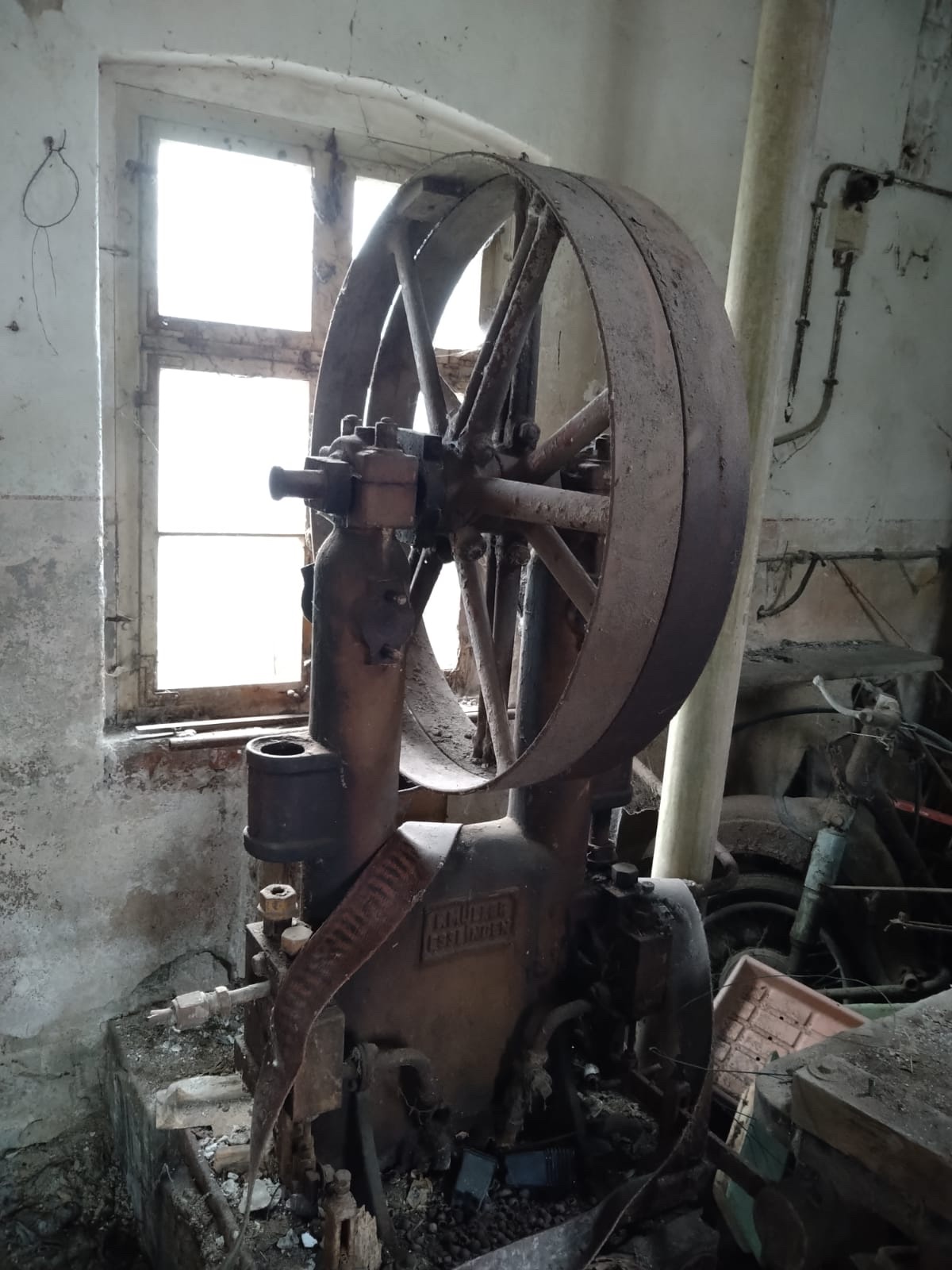 Auf dem Bild ist sie noch im Fundzustand. Sie stand in einer alten Ölmühle, wo sie bei einer Presse als Hydraulikaggregat gedient hat.