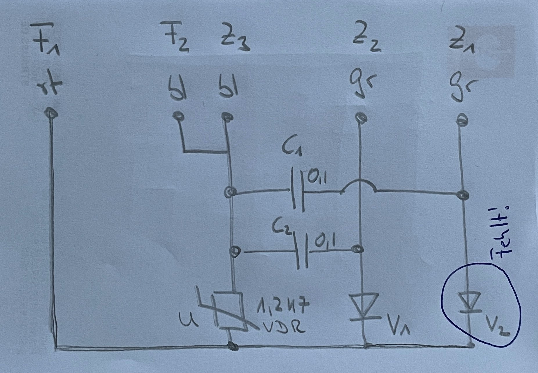 Die Platine ist nur mit einer Diode bestückt: V1, der Platz für V2 war schon immer frei.