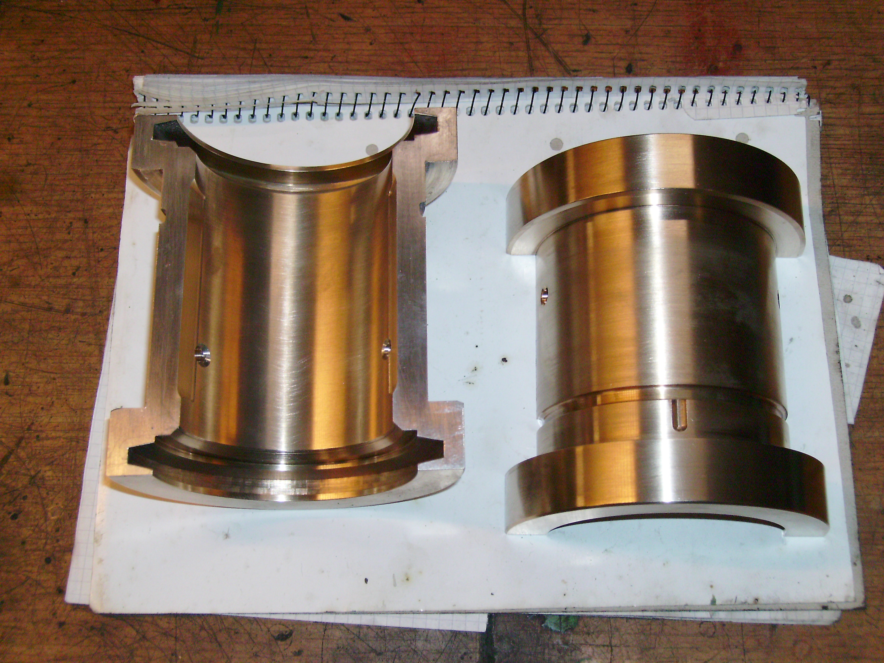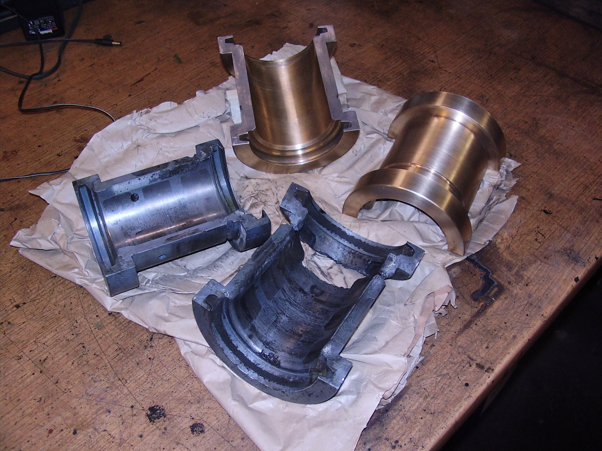 Der Aufsatz auf dem Kolben ist ein Teil des Verbrennungsraumes. Er ist auf dem Graugusskolben aufgeschraubt und hat 3 tangential angeordnete Bohrungen. Auf OT Stellung bildet der Aufsatz mit dem Verbrennungsraum im Kopf eine geschlossene Brennkammer, da der Aufsatz in den Zylinderkopfseitigen Brennraum einfährt. Dort beginnt dann die Kraftstoffverbrennung . Die vollständige verbrennung beginnt, sobald der Kolben kurz nach OT die 3 Tangentialbohrungen zum Zylinder hin frei gibt. Dieses Verbrennungsverfahren begünstigt das Startverhalten des Motors ( selbst bei tiefen Temperaturen springt der Motor ohne Zündfix an, der Motor verdichtet sehr hoch ) und hat einen sehr weichen Motorlauf ohne jegliches Dieselnageln zur Folge ( ähnlich wie beim M-Verfahren von MAN, die Motorabgase des DEMAG Motors riechen auch ähnlich streng ). Bei O&K wurde dieses Verbrennungsverfahren ebenfalls angewandt. Das Schutzgehäuse hatte ich zur Motorreinigung nicht demontiert, dafür reichten die Wartungsklappen im Gehäuse. Die Lok wiegt betriebsbereit 4 Tonnen, Länge über Puffer ca. 2700 mm, Breite 1020 mm, Höhe ohne Dach 1090 mm. Der Motor hat eine Bohrung von 120 mm und einen Hub von 190 mm. Neue Lagerschalen der Vorderachse hab ich auch schon angefertigt da die alten trotz der geringen Betriebsleistung der Lok aufgrund schlechten Materials gebrochen waren.
