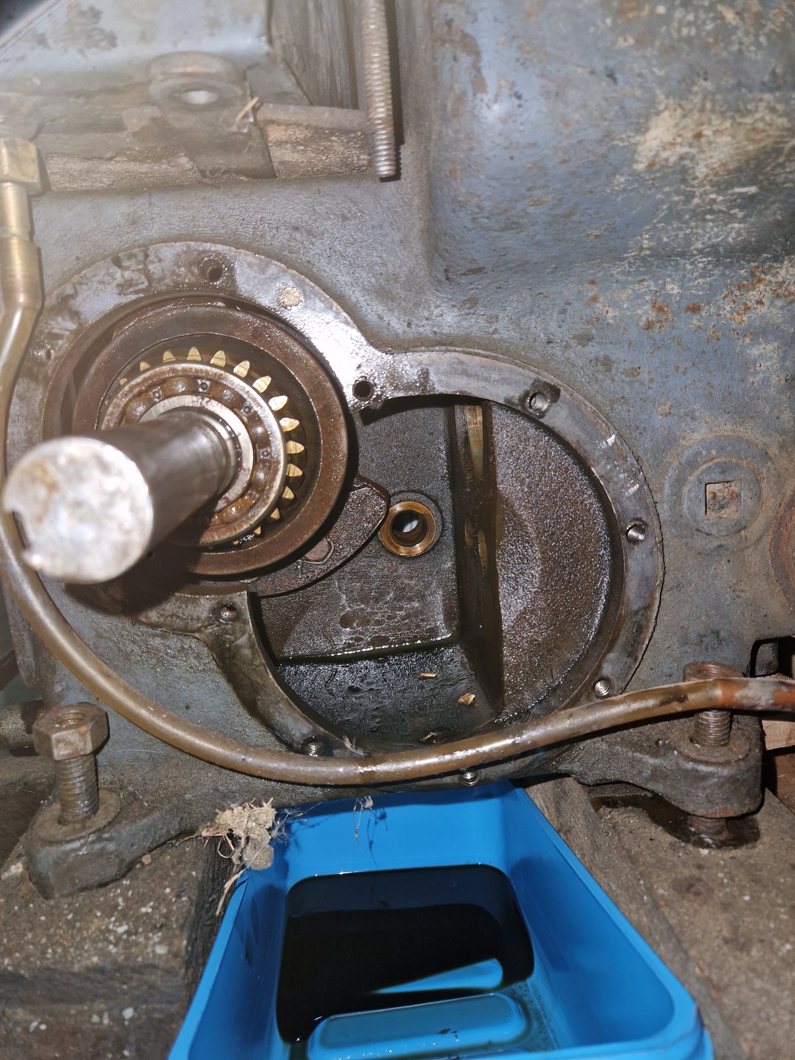 Die Schmierung erfolt durch Spritzölschmierung, wobei das Öl vom Nockenwellenrad aufgenommen und beim Kämmen mit dem KW-Rad durch die Schrägverzahnung in den Schleudering der KW gedrückt wird. Mittel Querbohrung wird der Hubzapfen und alle alle weiteren Teile versogt. Wobei ich ehrlich gesagt nicht ganz verstehe wie das Öl zum Regler bzw den Ventilführungen gelangen soll. da bin ich noch am Rätseln
