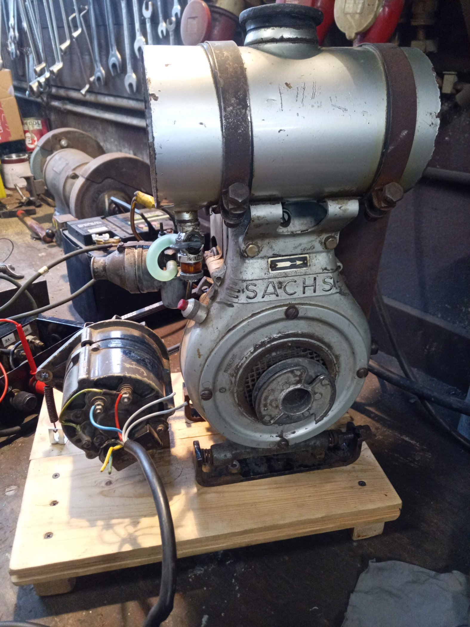 habe ich das Motörchen mal wieder vorgekramt und mit einer ebenfalls vorhandenen Lichtmaschine garniert. Angezogen, läuft