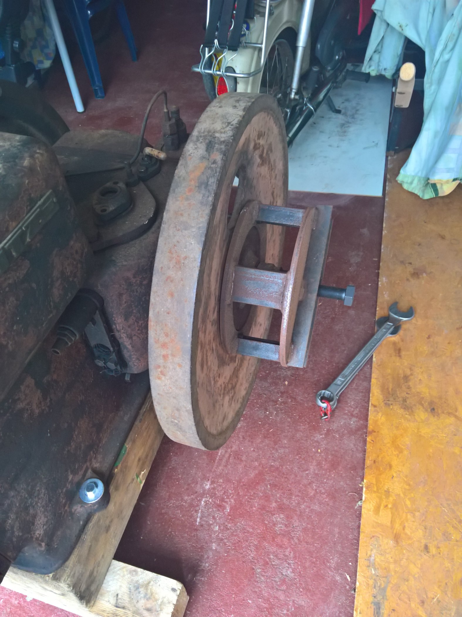 Mit einem schweren Kunstoffhammer auf den äußeren Rand des Schwungrades geschlagen und dabei das Rad immer in Drehung gehalten so dass jeder Schlag ca.30cm weiter trifft. Geht am besten zu zweit damit jemand die Schwungscheibe immer drehen kann.