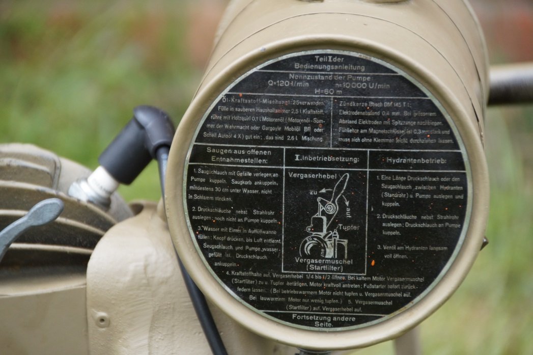 Aufgrund der Ausführung des Typenschildes würde ich fast vermuten, dass dieser Motor nach 1945 in Werk komplettiert wurde. Auch wurde im Krieg eigentlich nur Graetzin-Vergaser von Jlo verbaut. Im Krieg hatte der Motor im Werk die Bezeichnung AE150P. P für Pumpenausführung, da das hintere Gehäuse entsprechend für das Übersetzungsgetriebe der TS 1 angepasst war. Ich habe eine vergleichbare Pumpe von Flader. Der Motor trägt die FBC-Kennung. An meiner Pumpe fehlt die 2. Seite der Bedienungsanleitung vom Tank, ist die bei Deiner Pumpe noch vorhanden? Ist der Pumpenhersteller bekannt?