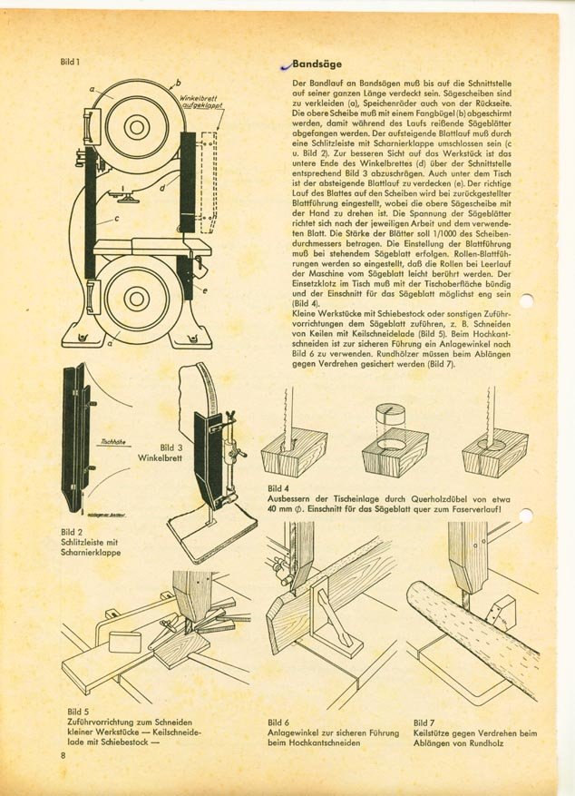 Hallo, alle zusammen. Ich habe div. Bandsägen u a. zwei von Kirchner aus Leipzig Sellerhausen. Eine kleine Bandsäge, mit 600 mm Raddurchmesser (Hanitula HNC 0 m), die nehme ich nur für feine Schnitte. Eine große Bandsäge (Haniwela HNC 2 m „Gloria“ und kostete 1190,00 RM laut Angebot von Ende 1930) mit 800 mm Raddurchmesser, 3PS und geliefert 1931. Im Folgenden berichte ich nur von der großen Bandsäge. Also, das Wichtigste ist immer, dass die Blätter superscharf und einwandfrei geschränkt sind. Auf dieser Bandsäge habe ich schon Eichenbohlen von 450 mm Breite hochkant stehend aufgetrennt, auch z.B. Kirschbaumstämme (die man gerade noch zu zweit tragen kann) in Bretter/Bohlen geschnitten. Ich brauchte auch schon mal Sägefurnier, 1,5 mm dick Nussbaum- auch 450 mm breit, also hochkant durch die Maschine, auch das war kein Problem. Mit dieser Maschine habe ich zig Kubikmeter Feuerholz geschnitten, dazu ein Sägeblatt aus Schwedenstahl mit 40 mm Breite und 10 mm Zahnteilung: Da kommt keine Kreissäge und keine Wippsäge mit. Bei Rundholz wird es knifflig, wenn das Stück lang genug ist, muss man es schon sehr gut festhalten und etwas rückwärts drehend in die Säge schieben, also so, dass das Holz oben vom Blatt weggedreht wird. Oder man benutzt einen Keil mit abgezwickten Nägeln, wie auf dem Bild unten rechts Bild 7. Ganz kurze Stücke sind nicht ratsam (oder man hält sie mit einer richtig großen Wasserpumpenzange, damit die Finger in Sicherheit sind – aber das ist nicht so die geniale Idee). Dann gibt es noch die Möglichkeit, wie auf dem Foto „Schiebeführung“, an dem Tisch eine Führungsleiste anzuschrauben, in die ein kleiner Schlitten eingehängt wird. Auf diesem Schlitten kann man dann zwei Keile (rechts und links vom Blatt) mit den abgezwickten Nägeln oder abgeflexten Schnellbauschrauben befestigen und schon ist man auf der ziemlich sicheren Seite oder eben so, wie im obigen Link die BG-Vorrichtung. Ich brauche etwa alle 5 bis 8 Jahre ein Blatt. Eigene Schärf- und Schränkmaschinen vorhanden, somit geringe Schärf- und Instandhaltungskosten. Wenn es aber so passiert, wie auf dem Foto von Burgfried, dass ein Rundholz „reindreht“, dann ist es vorbei, dann braucht man ein neues Blatt.
