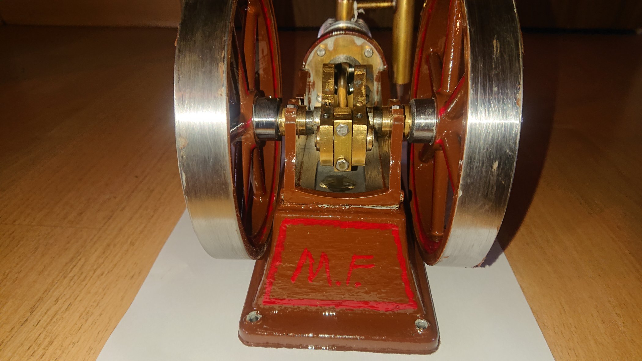 Danke für die schnelle Antwort. Mein Motor ist ungefähr 1,5 mal so groß wie das Original. Ich habe die erste Gas Vorrichtung einfach 1,5 mal so groß wie in der Patentzeichnung gemacht damit hatte der Motor aber nicht genug Leistung um dauerhaft seine eigene Reibung zu überwinden. Im original mündet das Rohr einfach offen in das große Messingrohr und sorgt dafür dass sich der Motor drosseln lässt. Bei meinem Motor ist in dem großen Messingrohr ein durchgehendes Rohr das das Gas direkt vor das Einlassloch leitet damit der Motor genug Gas bekommt. Und ich habe die Luft zuführung angepasst. Die Vorrichtung ist nur noch für die Optik da und im Inneren sind die nachträglichen Änderungen versteckt. Naturgesetze lassen sich nicht einfach Maßstäblich vergrößern.