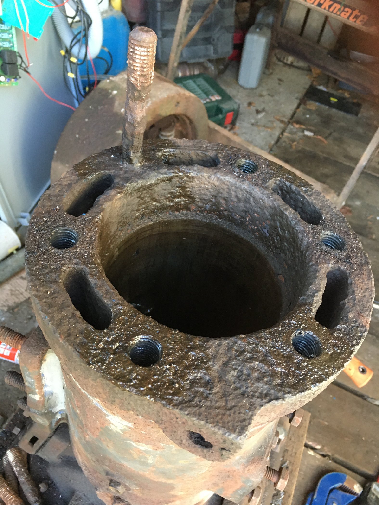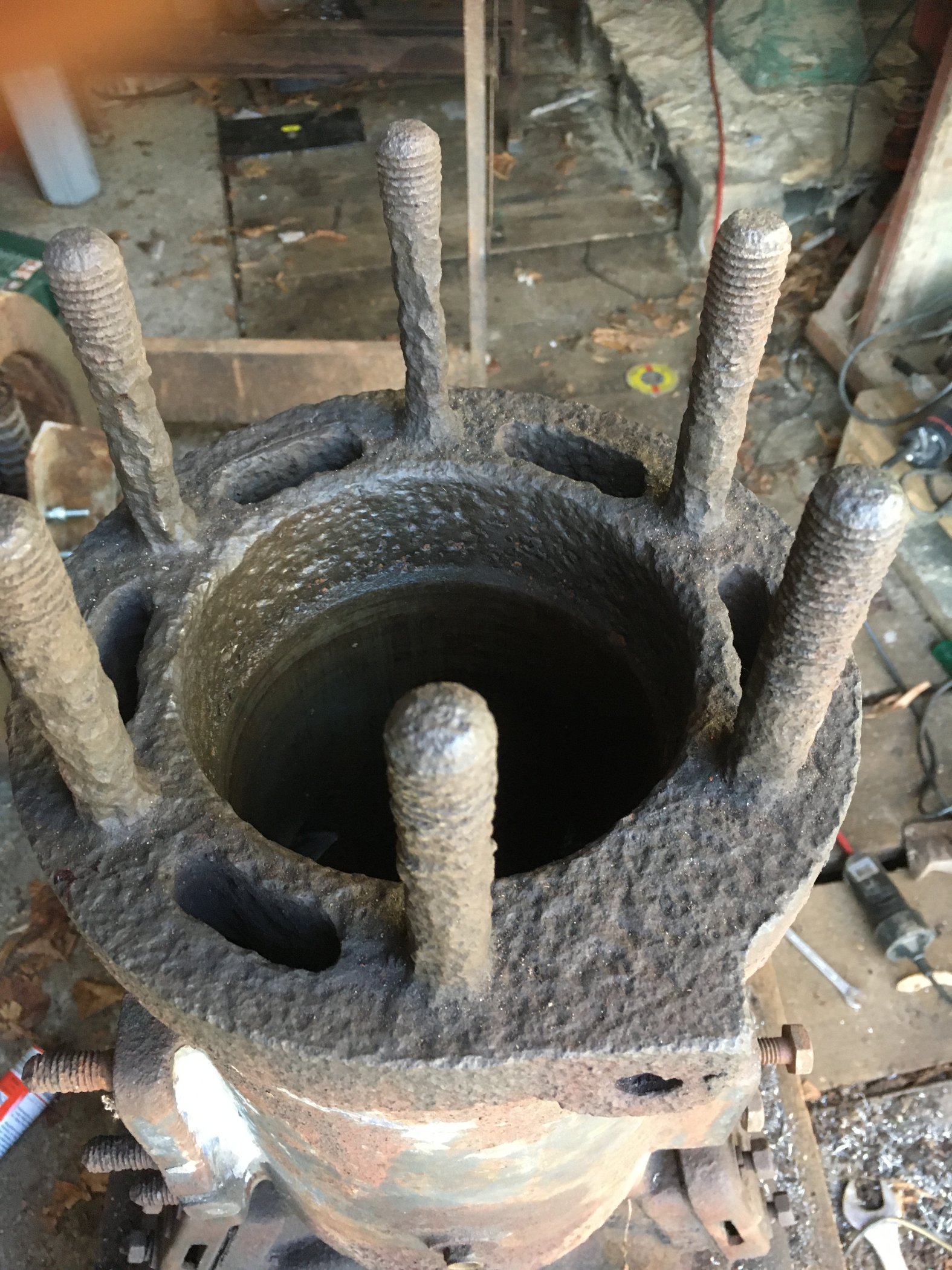 Mit Geduld, Rohrzange und Druckluftmeißel zum Vibrieren kamen 5 Stück - einer wehrt sich noch. Ich hätte lieber mit Kontermuttern gearbeitet, fand aber kein passendes Schneideisen 3/4"