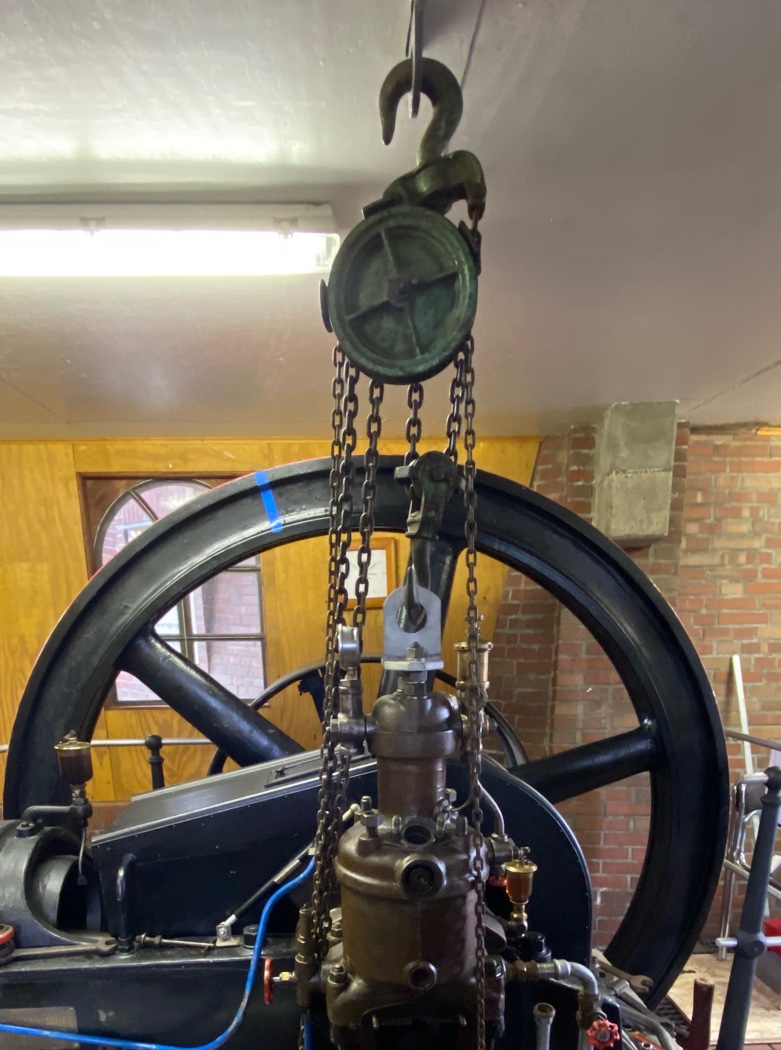 Das letzte ungeprüfte Bauteil sind die Kolbenringe der ersten und zweiten Verdichterstufe. Diese hätten wir gerne überprüft. Leider konnten wir trotz zentraler Abziehvorrichtung und Hilfe eines Kettenzuges (Siehe Foto) weder den Deckel, noch den oberen Einsatz herausnehmen.Da wir natürlich keine Gewalt anwenden wollten, haben wir den Versuch abgebrochen.