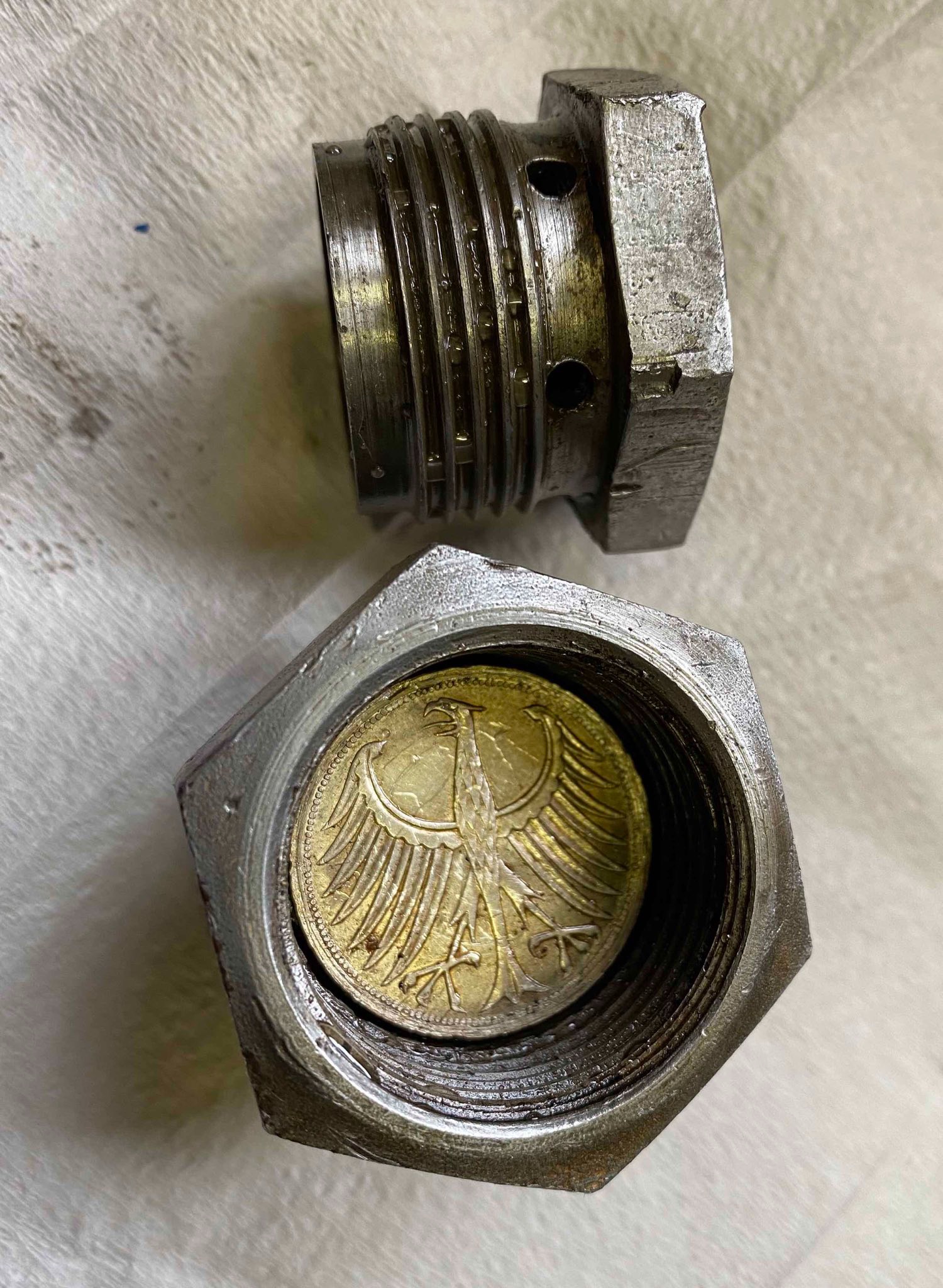 Bei Ausbau der Verschraubung erwartete uns eine Überraschung. Ein altes 5 DM Stück dichtete die Verschraubung von innen ab (Siehe Foto). Weiß jemand wie diese Abdichtung im Original aussah?