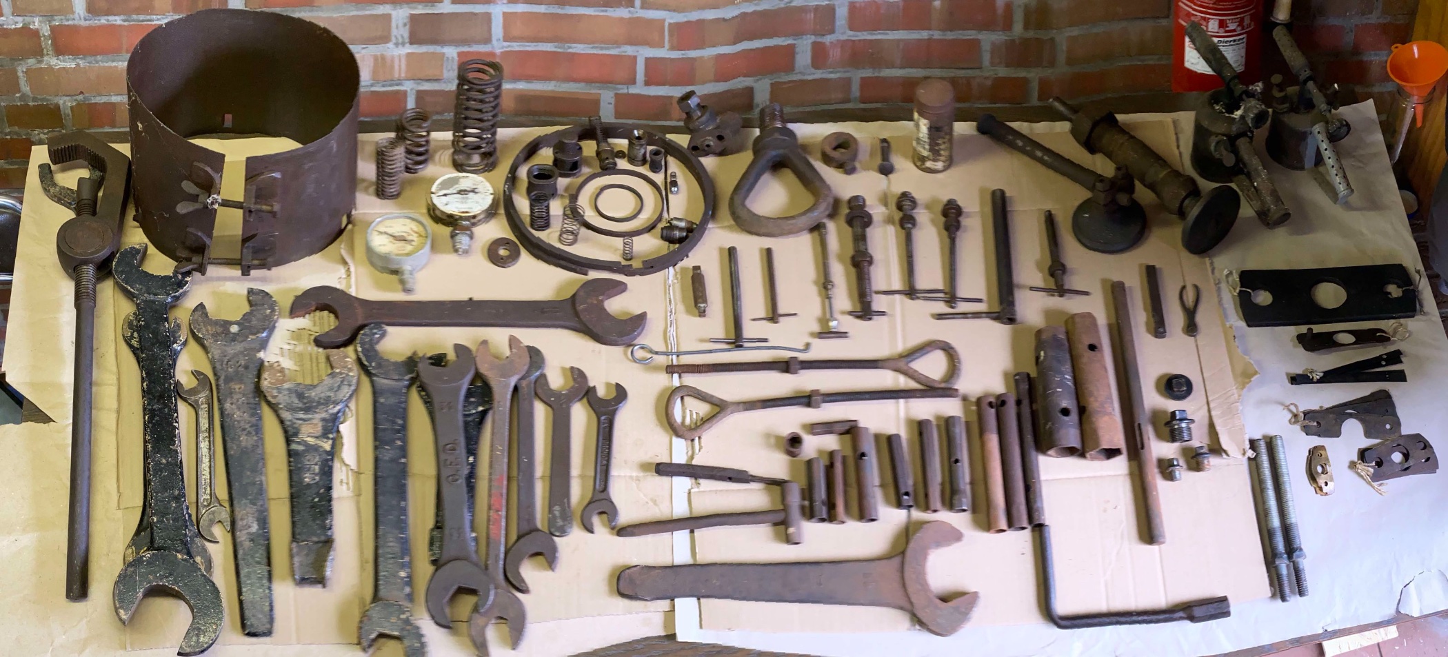 Morgen (Donnerstag) werden wir direkt einen weiteren Startversuch (Mit Druckluft) vornehmen und gucken wie viel Kompression die Luftpumpe aufbaut. Wir finden zwar viel Original-Werkzeug, Original-Ersatzteile und die Original-Bedienungsvorschrift vor, jedoch hilft das teilweise nur bedingt weiter. Eure Hinweise sind für uns wirklich Gold wert, Danke!